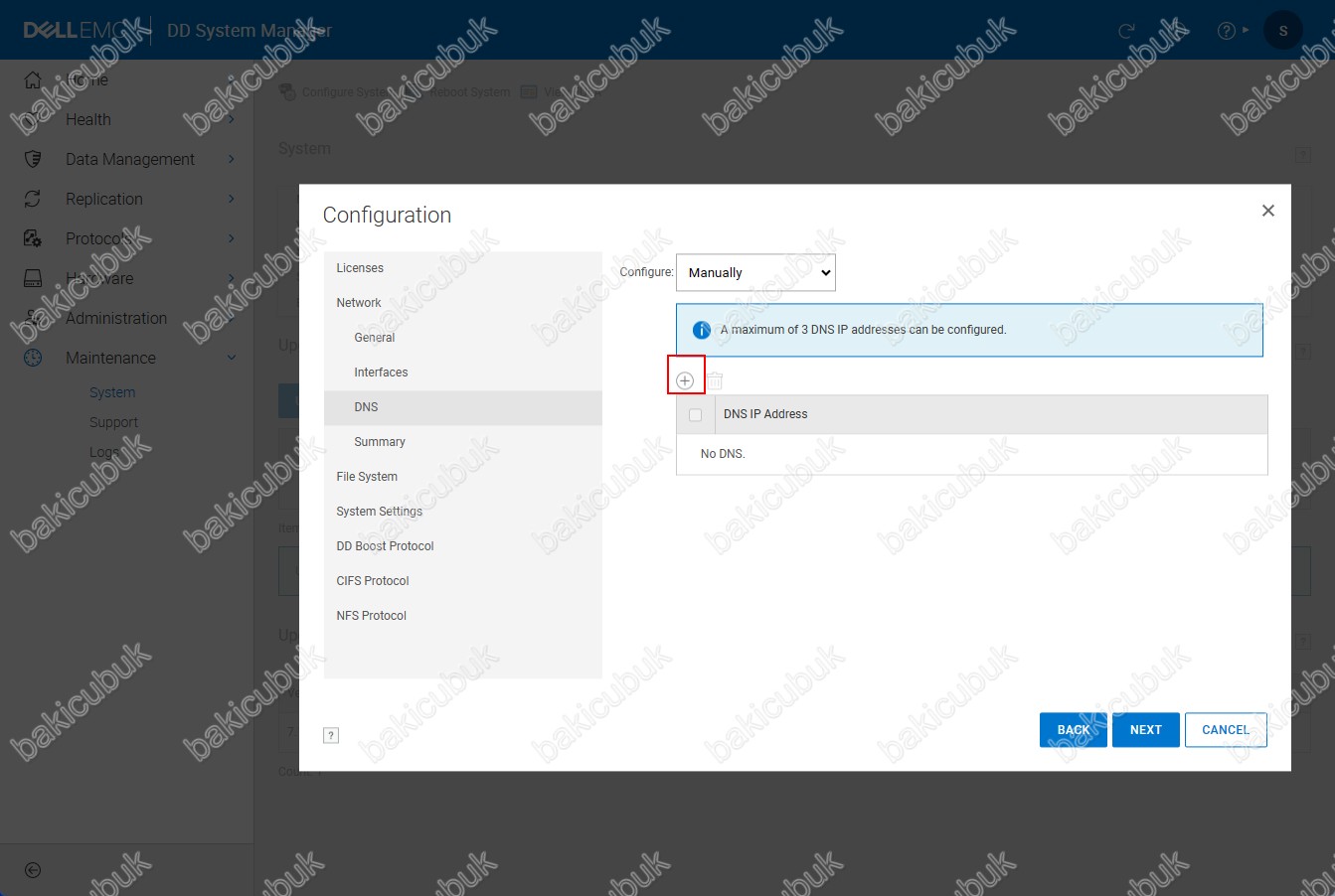 Configuration ekranında Network menüsü altında bulunan DNS seçeneği altında Configure seçeneği altında Manually seçeneğini seçtikten sonra + işaretine tıklıyoruz ve ekleyeceğimiz DNS Server IP Adres ya da DNS Server IP Adreslerini ekliyoruz.