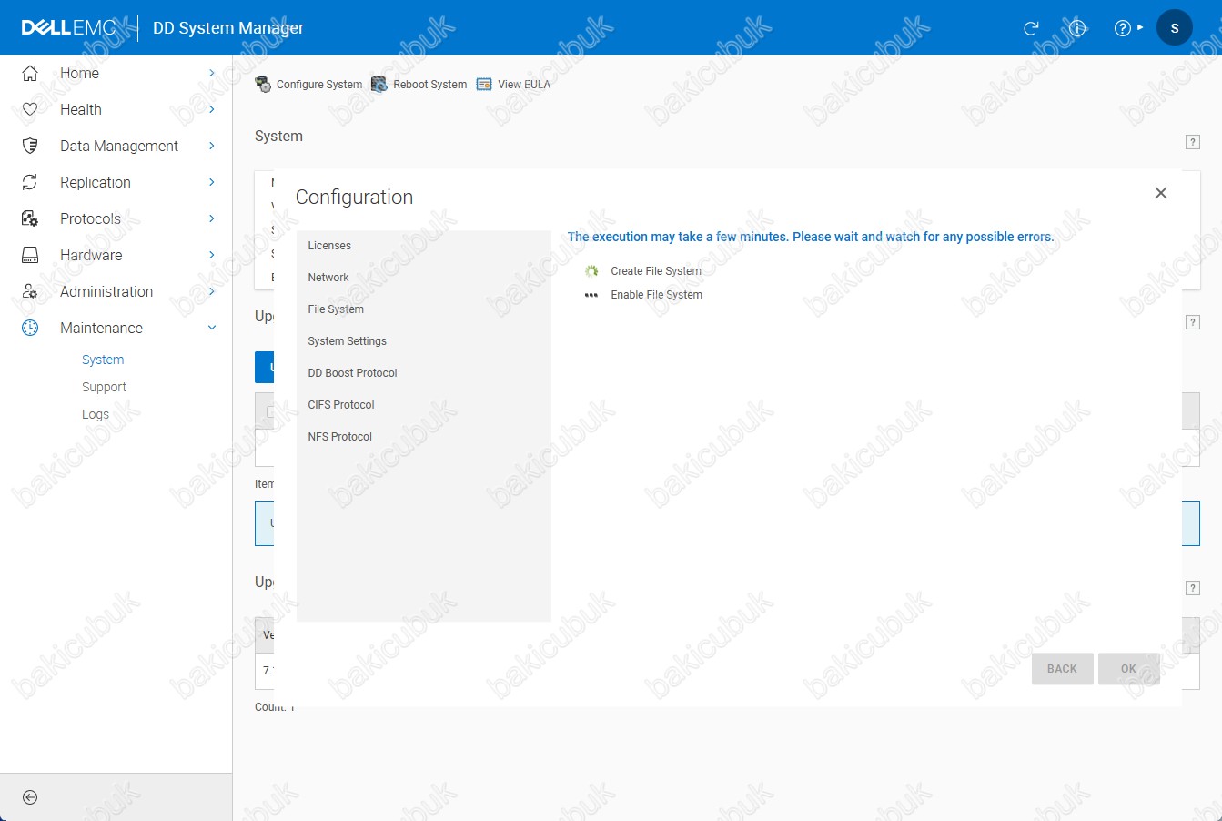 Configuration ekranında Dell EMC Data Domain Virtual Edition 7.11.0.0 Virtual Machine ( Sanal Makine ) üzerinde DD BOOST servisin de Create File System yapılandırma adımının tamamlandığını ve Enable File System yapılandırma adımında oluşturulan dosya sisteminin yapılandırmasının başladığını görüyoruz.