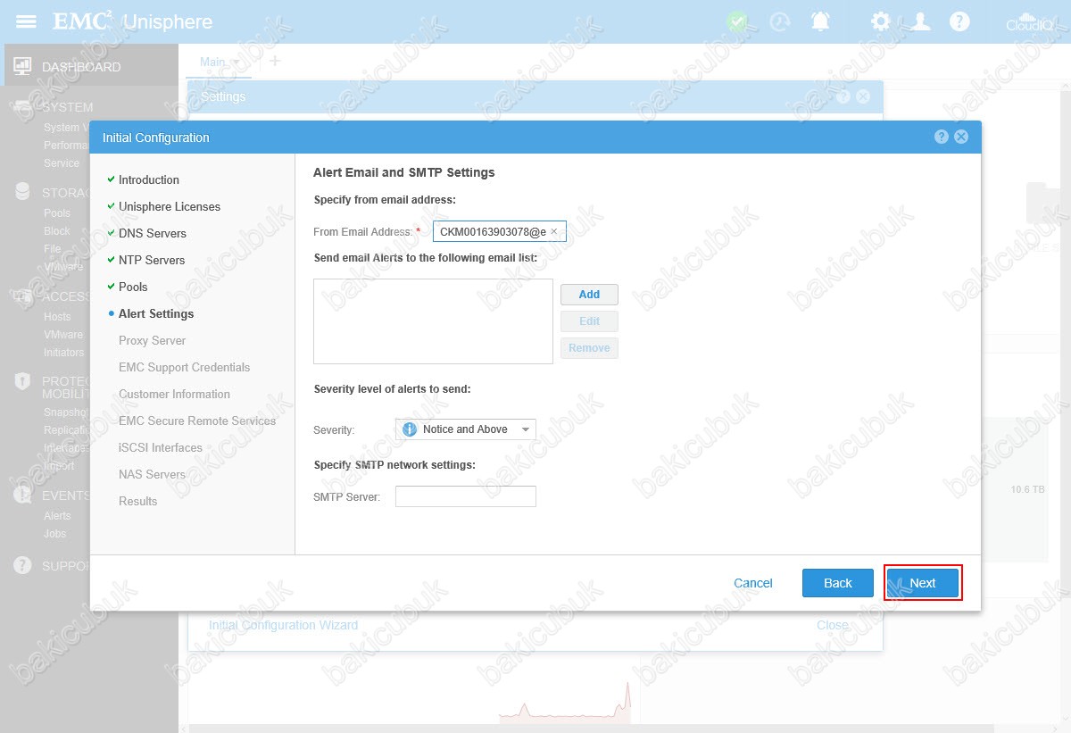 Alert Settings ekranında Dell EMC Unity 400F üzerinde oluşabilecek herhangi bir problemde size mail atmasını sağlayabilirsiniz. Next diyerek devam ediyoruz.