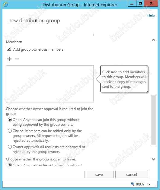 Alt bölümde bulunan seçeneklerde oluşturacağımız Distribution group üzerindeki bazi yetkilendirme işlemlerini yapabiliriz. Gruba kullanıcıların kendilerini ekleme yetkisi sadece belirli kullanıcıların gönderme yetkisi gibi ayarlari yapılandırabiliriz.