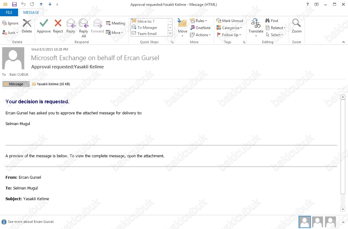 Bunun için Do the following.. bölümünde Forward the message for approval to.. seçeneğini seçiyoruz ve Approve user belirliyoruz.