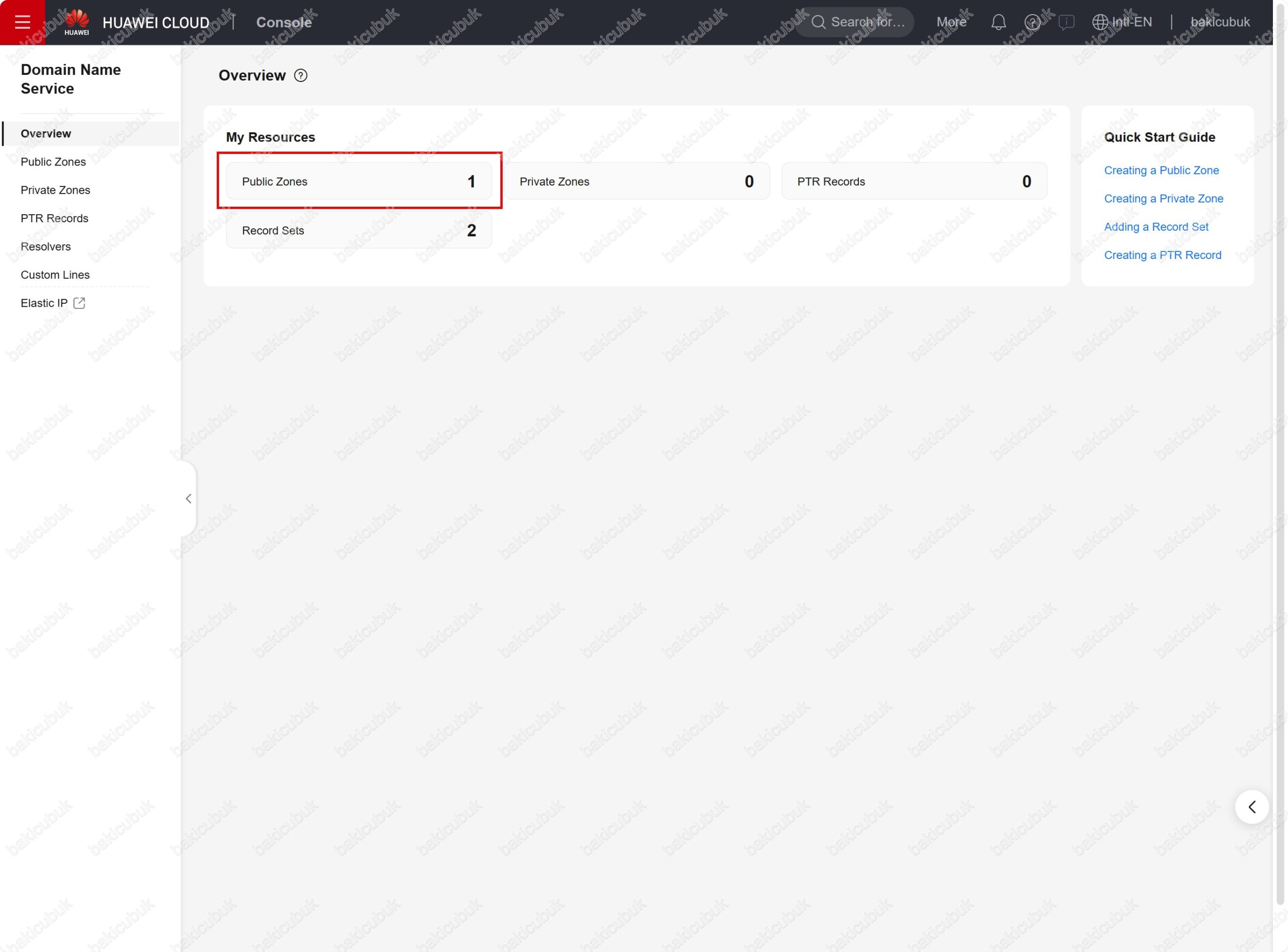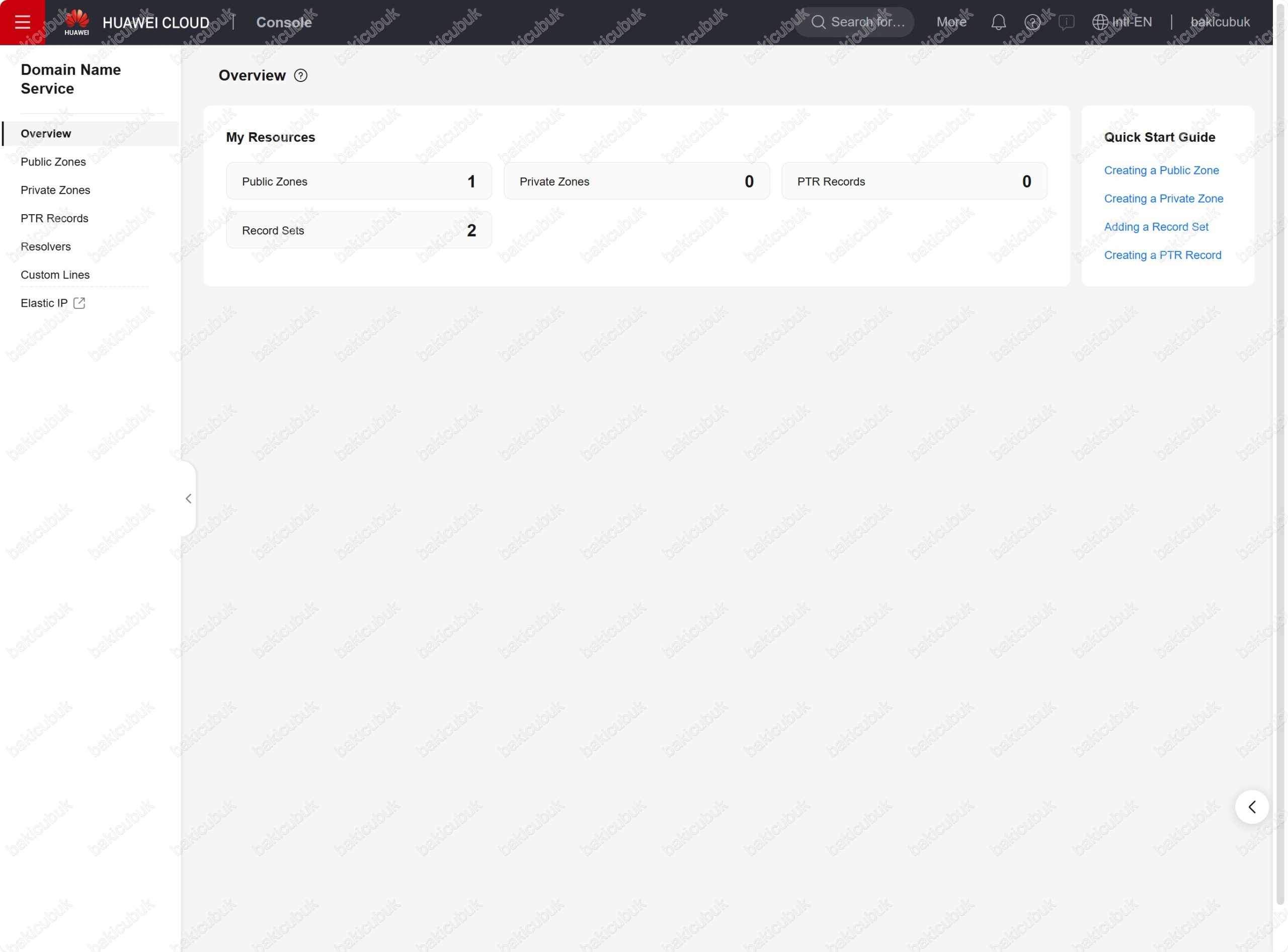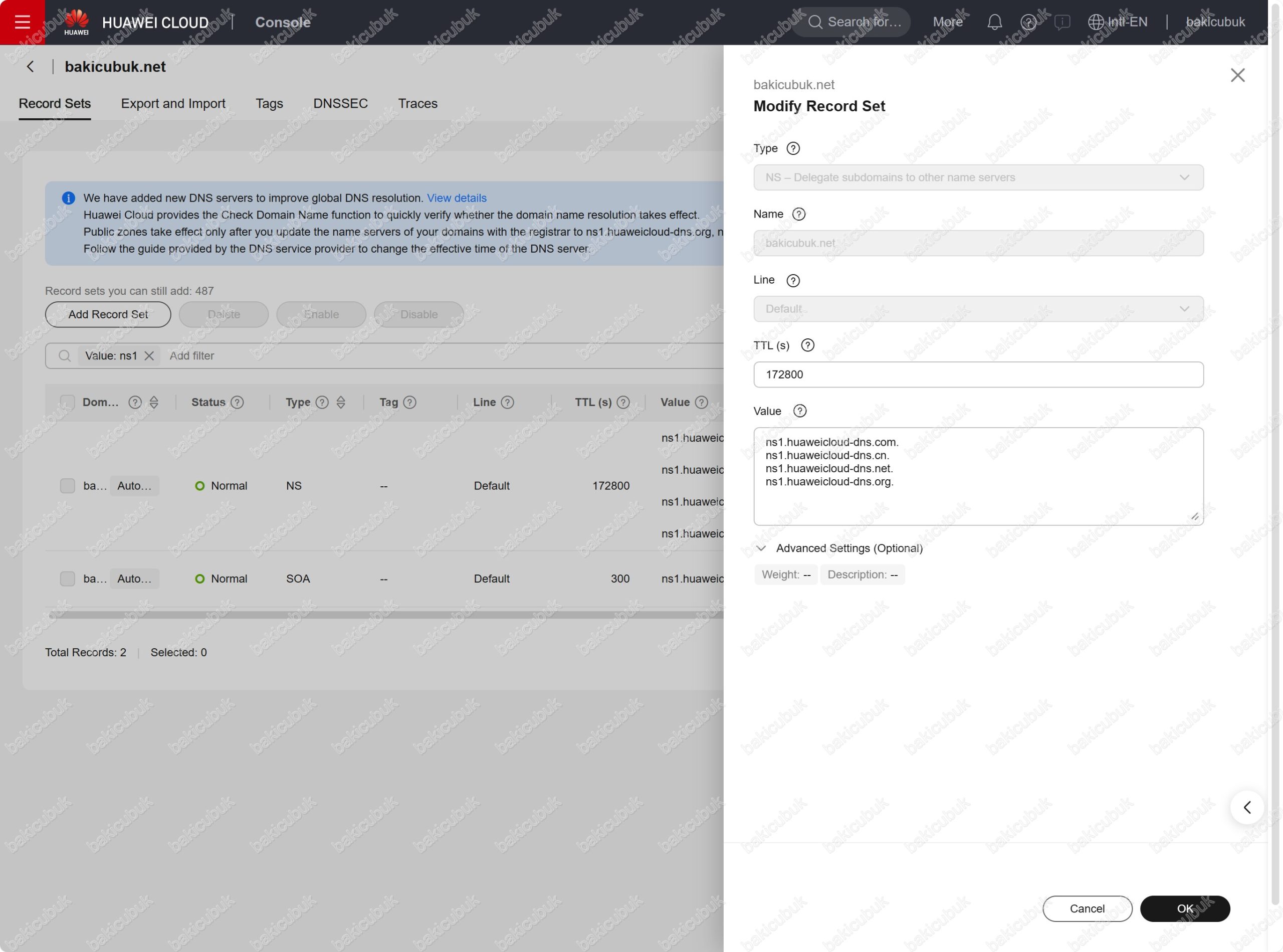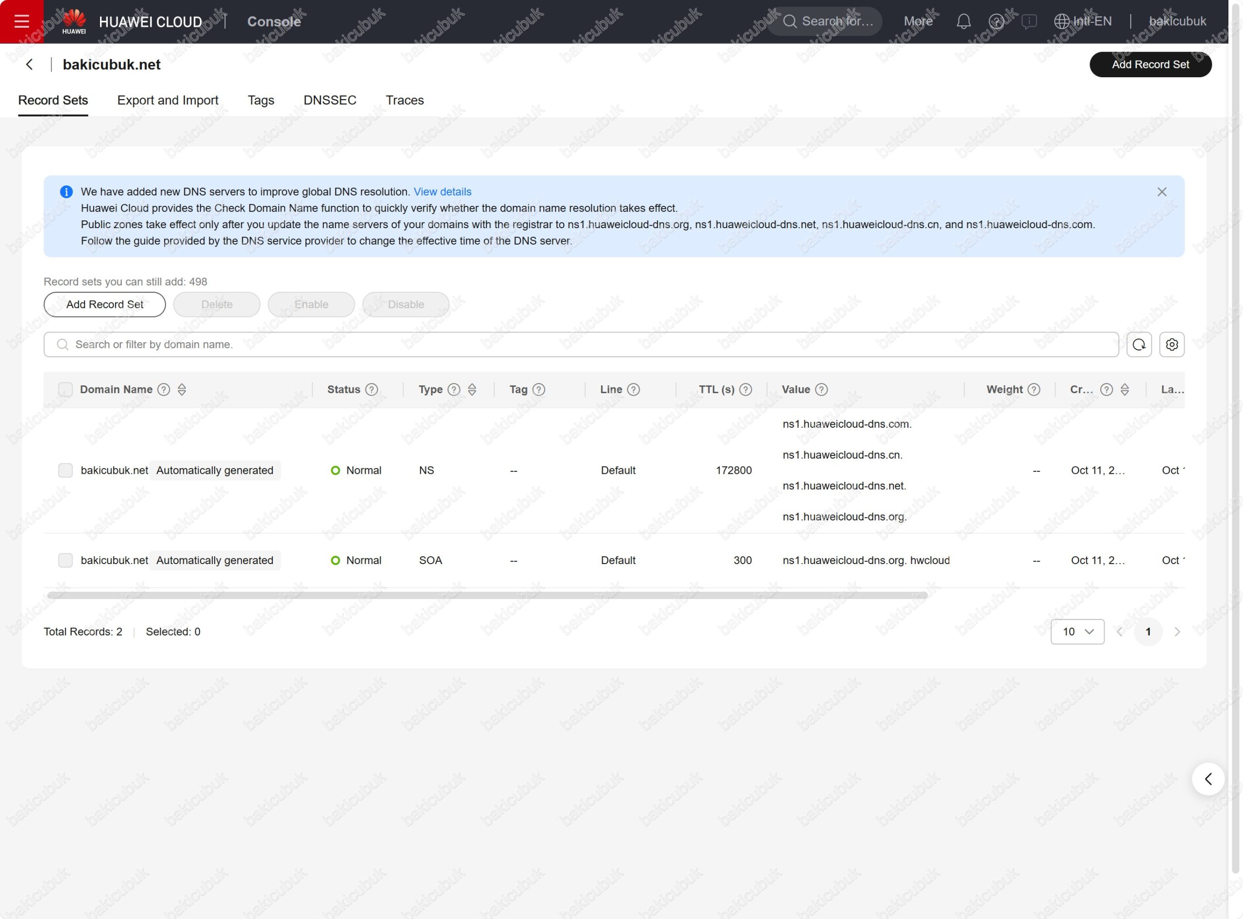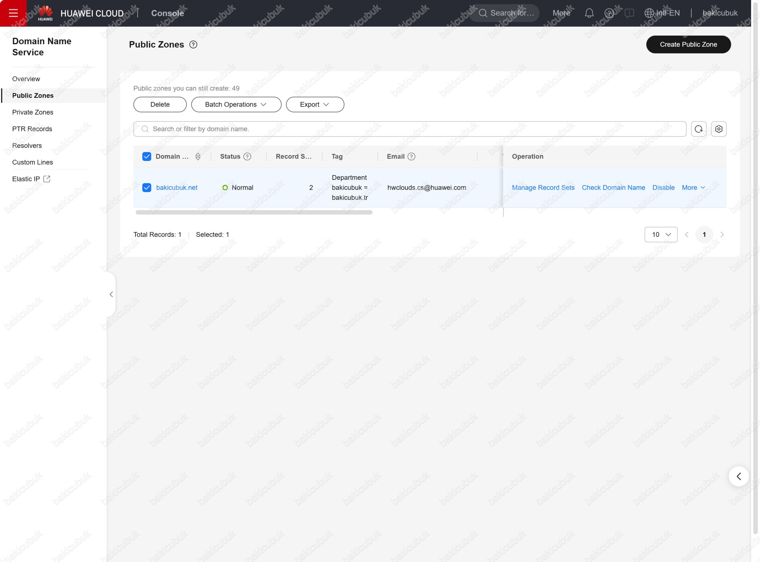 bakicubuk.net alan adı Huawei Cloud Public Zones yapılandırması üzerinden artık yönetebilirsiniz.