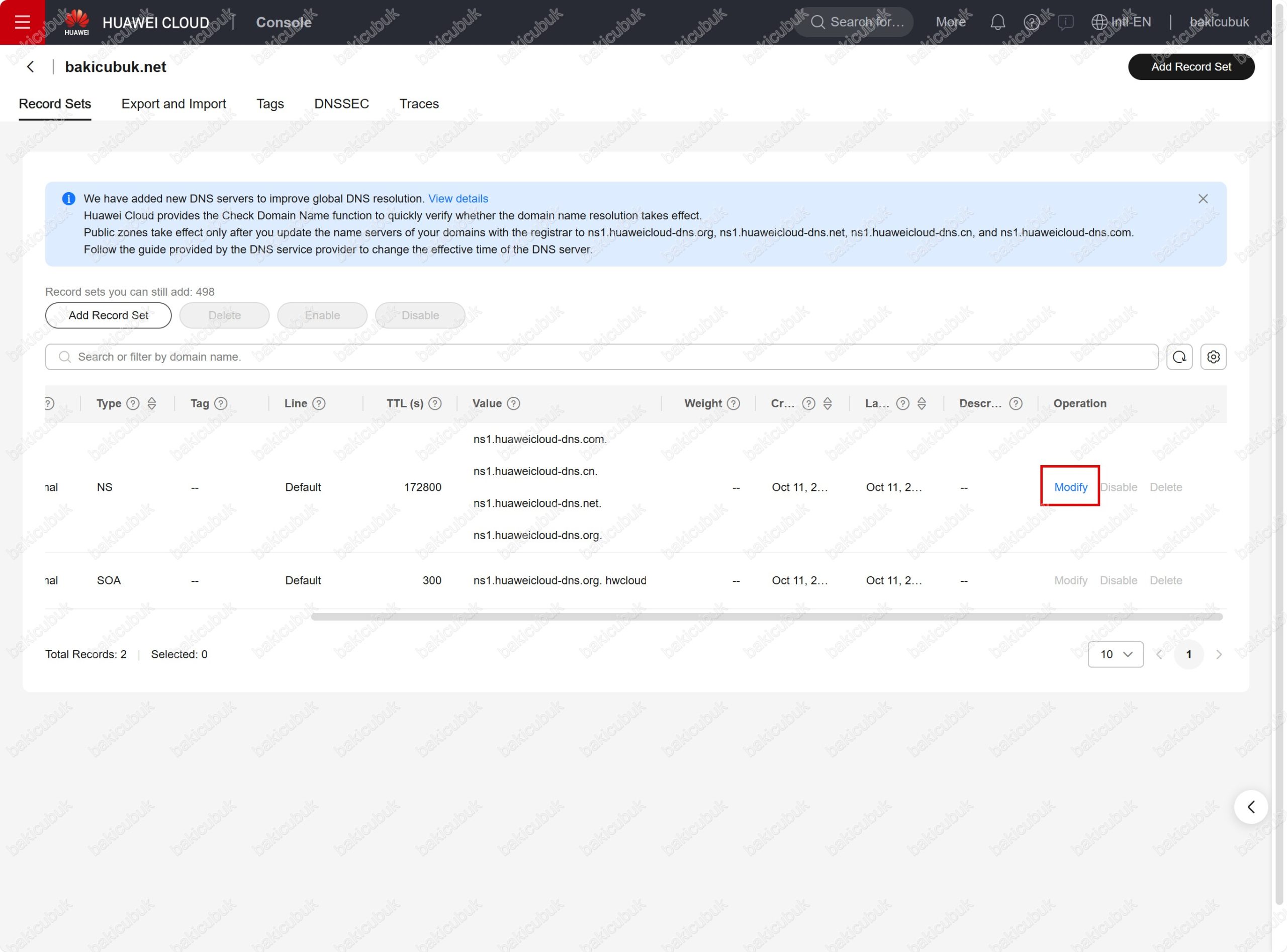 Huawei Cloud Console ekranında Public Zones menüsü altında bakicubuk.net alan adında Modify seçeneğine tıklıyoruz.