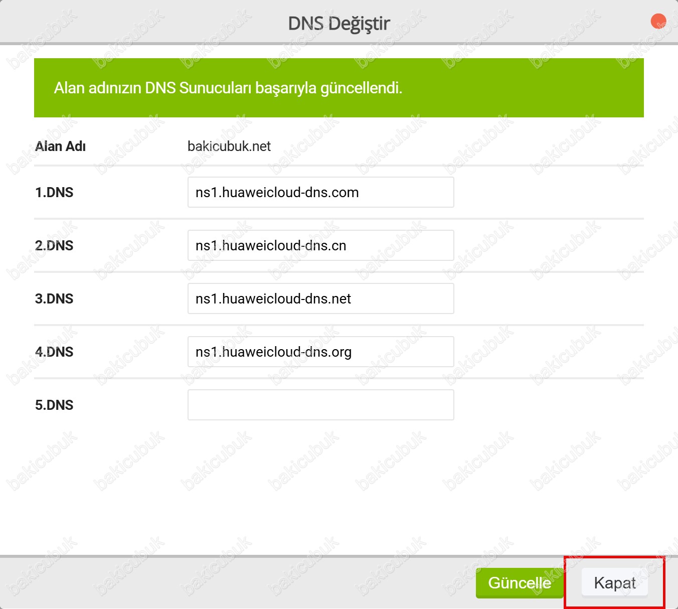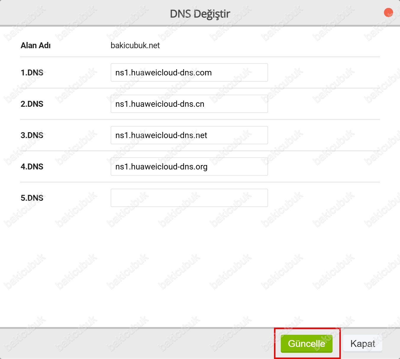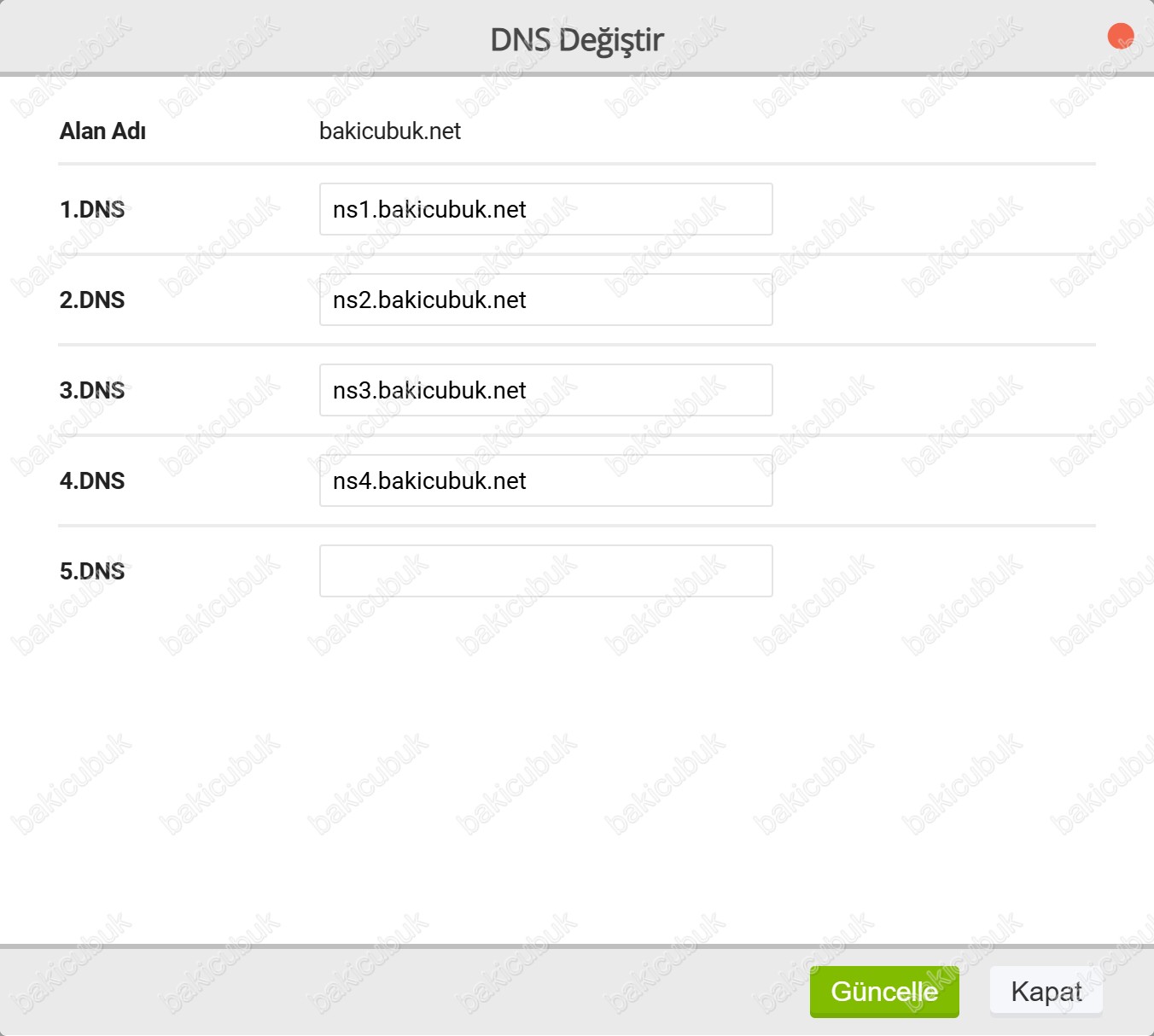 bakicubuk.net alan adının bulunduğu firma üzerinde DNS bilgilerini güncellememiz gerekiyor.