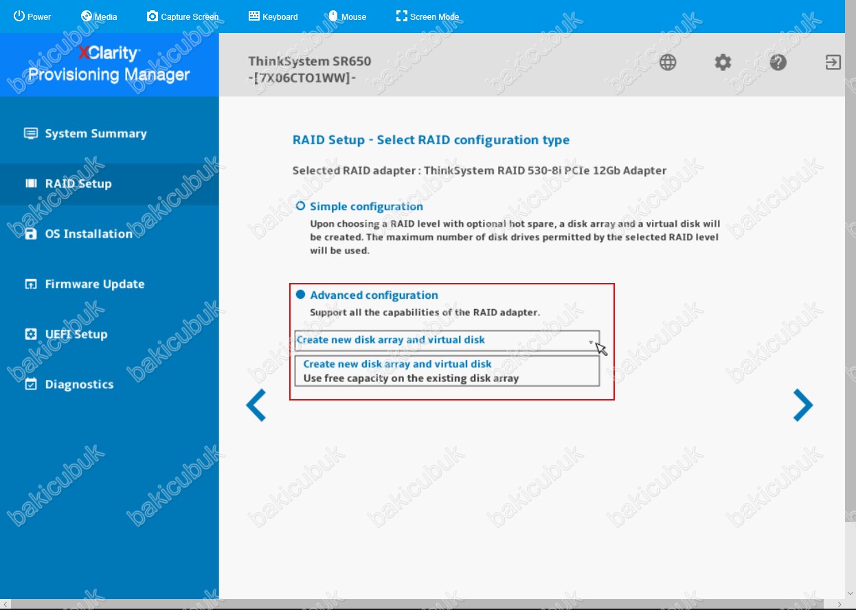 RAID Setup – Select RAID configuraiton type ekranında Advanced configuration seçeneğini seçiyoruz. Create new disk array and virtual disk seçeneği ile sunucumuz üzerinde ilk olarak RAID ve Disk alanı yapılandırmasını yapabilirsiniz. Use free capacity on the existing disk array seçeneği ile mevcut RAID yapılandırması üzerinde Free ( Boş ) alanlari kullanabilirsiniz.