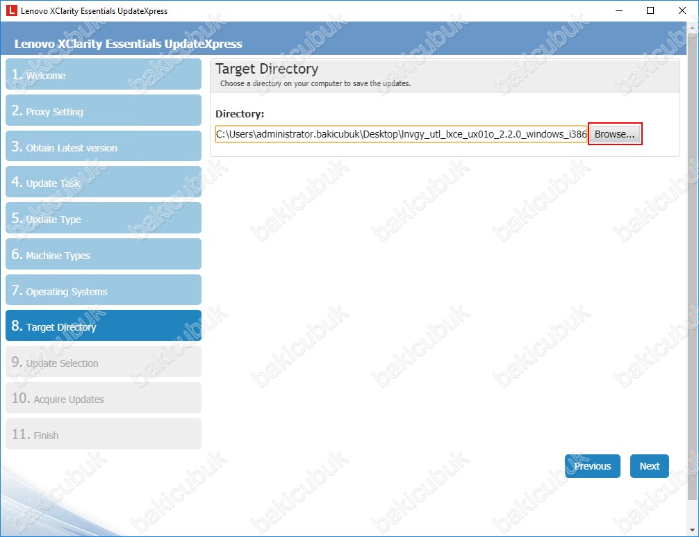 Target Directory ekranında sunucumuz için indirilecek olan güncelleştirmelerin sunucumuz üzerinde hangi dizine indirileceğini belirlememiz gerekiyor. Biz Browse diyerek C dizini altında C:\Lenovo_Update adında bir dizin oluşturuyoruz ve indirilecek olan güncelleştirmlerinin bu dizin altina indirilmesini sağliyoruz.