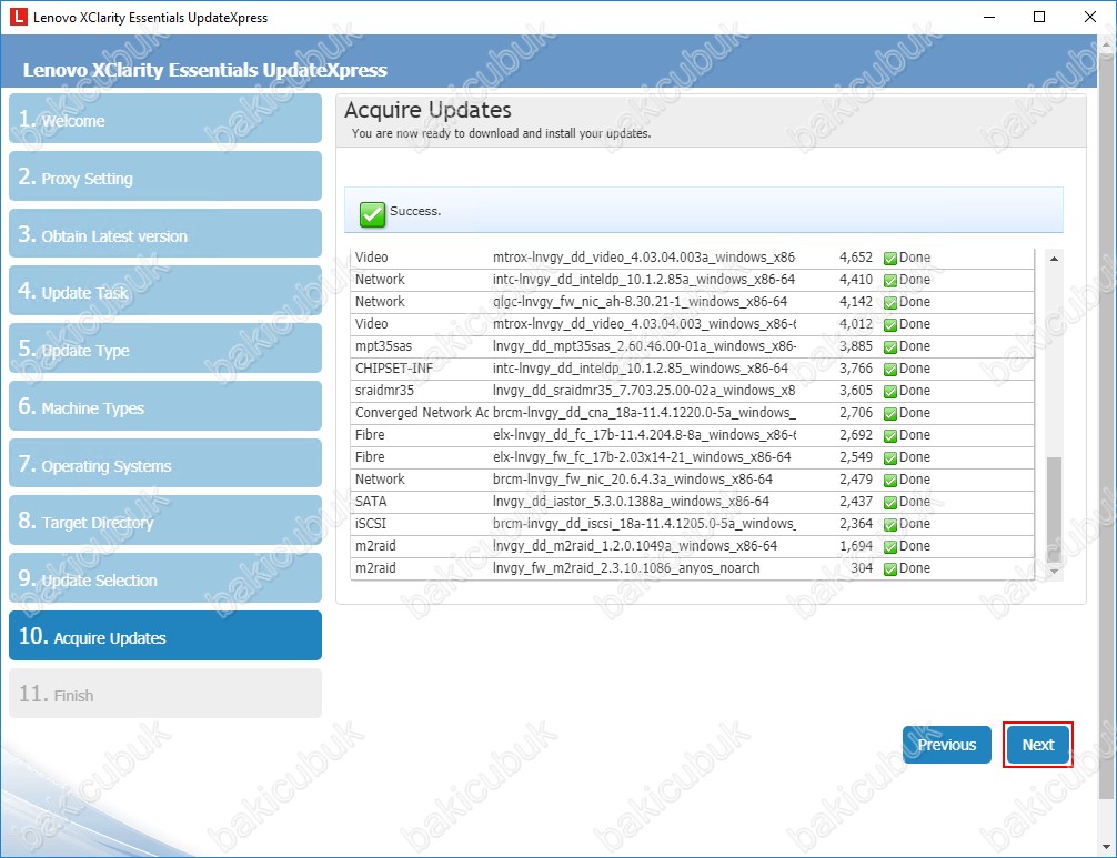 Obtain Latest Version ekranında Lenovo XClarity Essentials UpdateXpress yazılımı ve desteklediği sistemlerin güncellenme işlemi başarı bir şekilde tamamlanıyor. Next diyerek devam ediyoruz.
