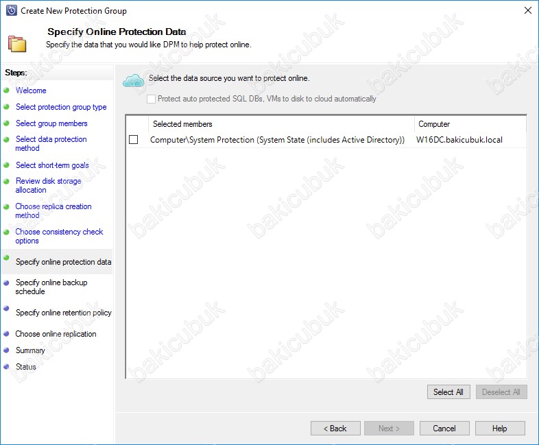 Specify online protection data ekranın da Selected members bölümü altında W16DC isimli sunucumuz üzerindeki System State (includes Active Directory ) dosyasını seçiyoruz ve Next diyerek devam ediyoruz.