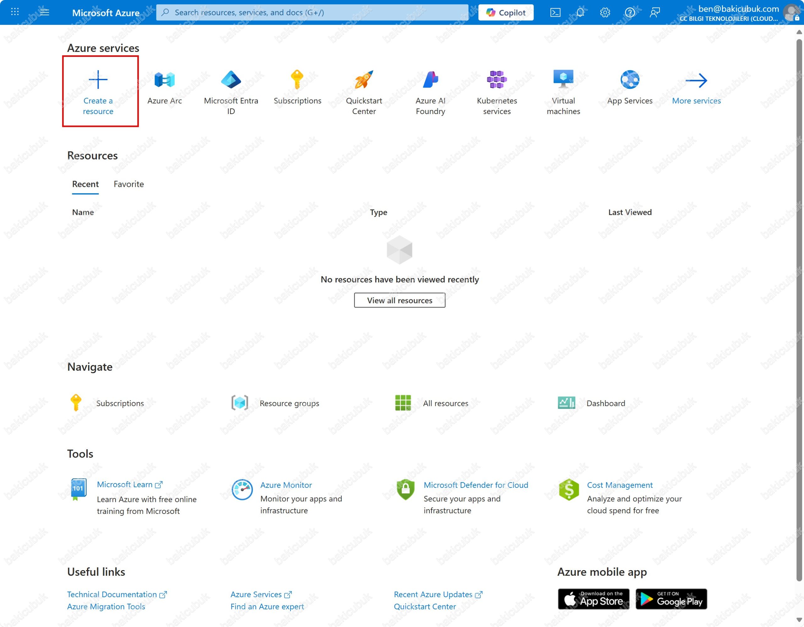 Create a resource: Azure Portal üzerinde yeni bir kaynak (resource) oluşturmak için kullanılan seçenektir. Bu seçenek, Azure Marketplace üzerinden yüzlerce hazır servis ve çözüm arasından seçim yaparak hızlıca kurulum yapmanı sağlar. Örneğin sanal makine, DNS zone, veri tabanı, sanal ağ veya depolama hesabı gibi farklı kaynaklar bu menü aracılığıyla oluşturulabilir. Her kaynak bir resource group içinde barındırılır ve oluşturulurken bölge (region) seçimi yapılır. Bu sayede kullanıcılar, ihtiyaç duydukları hizmeti birkaç adımda devreye alarak Azure altyapısında kullanıma hazır hale getirebilir.