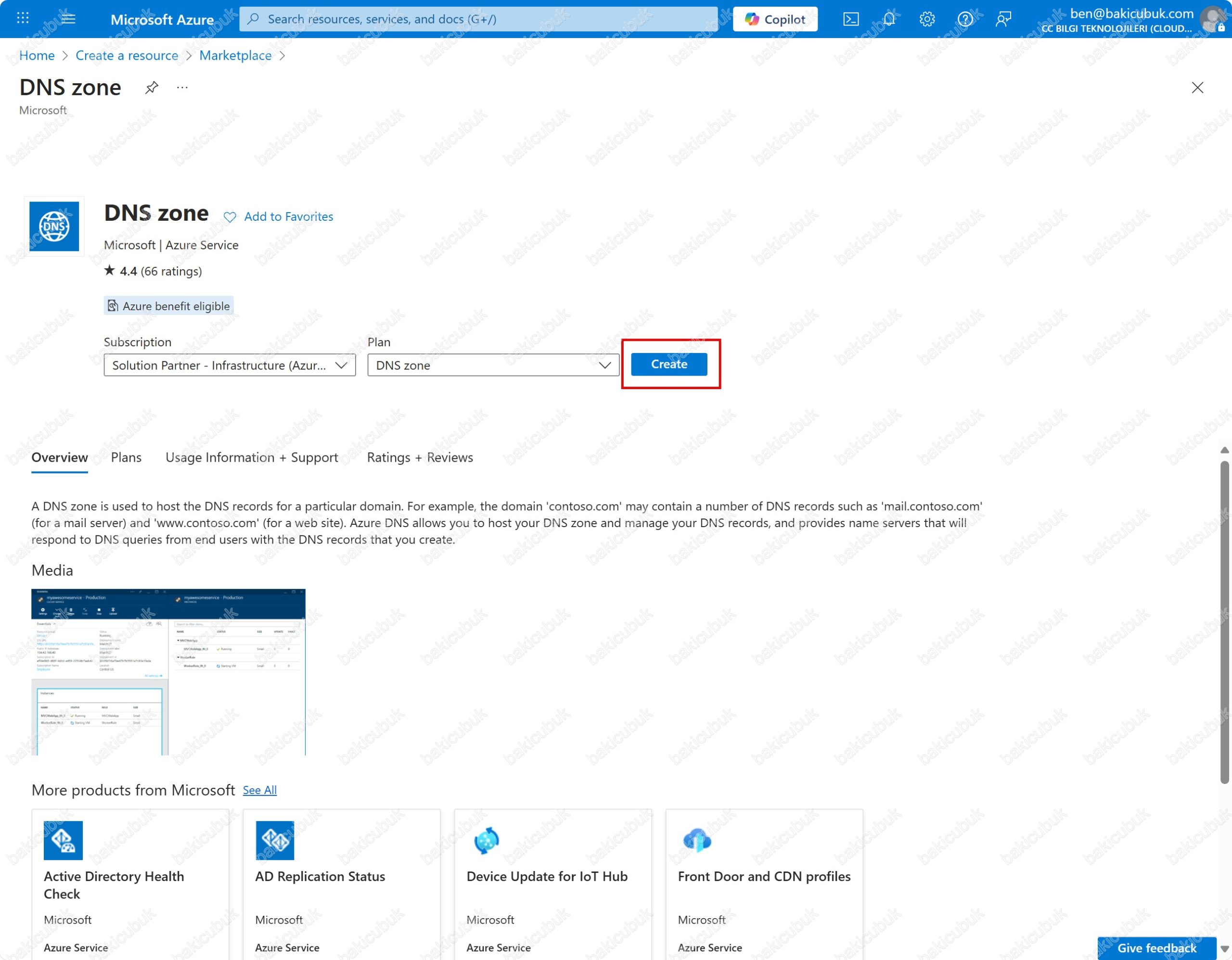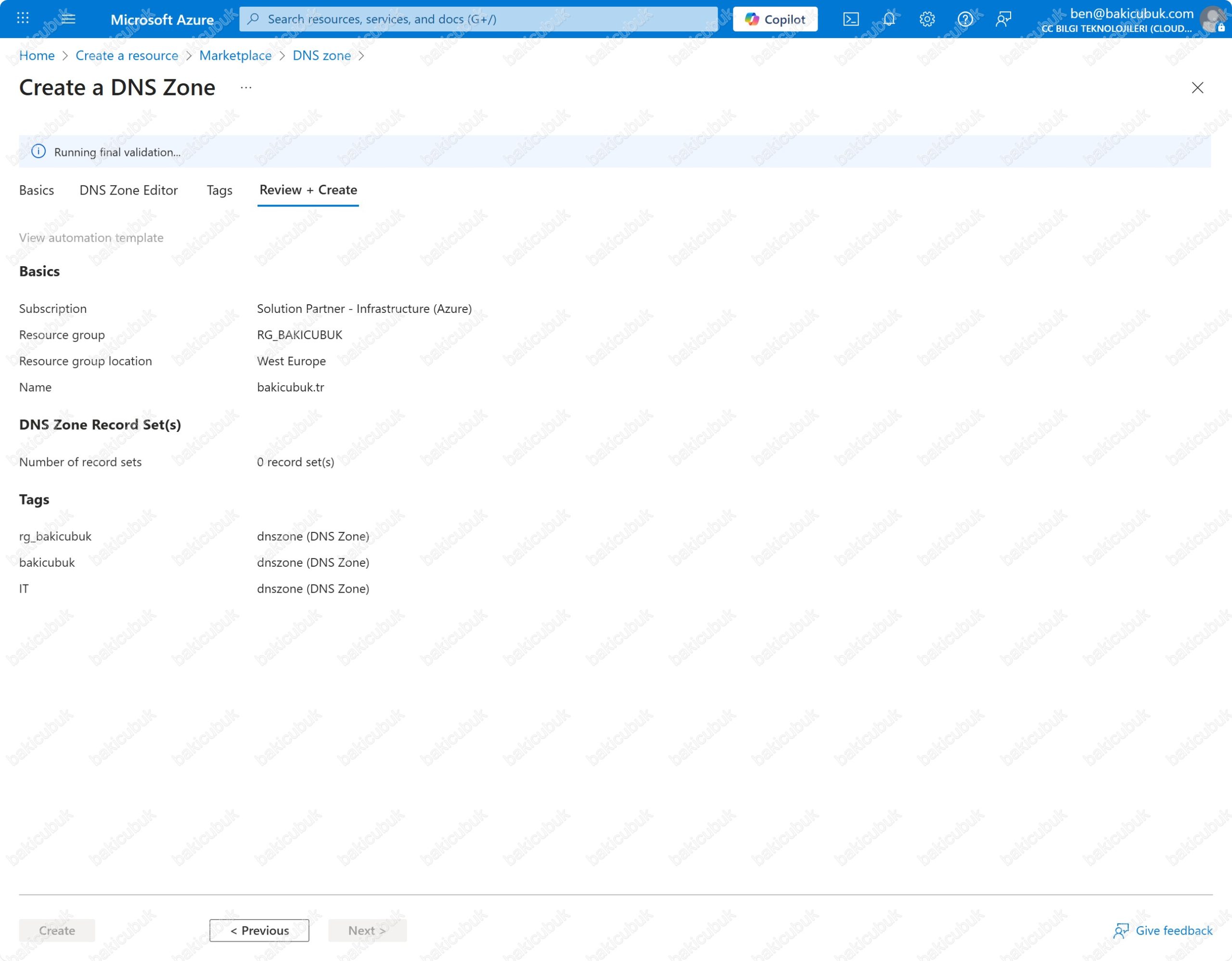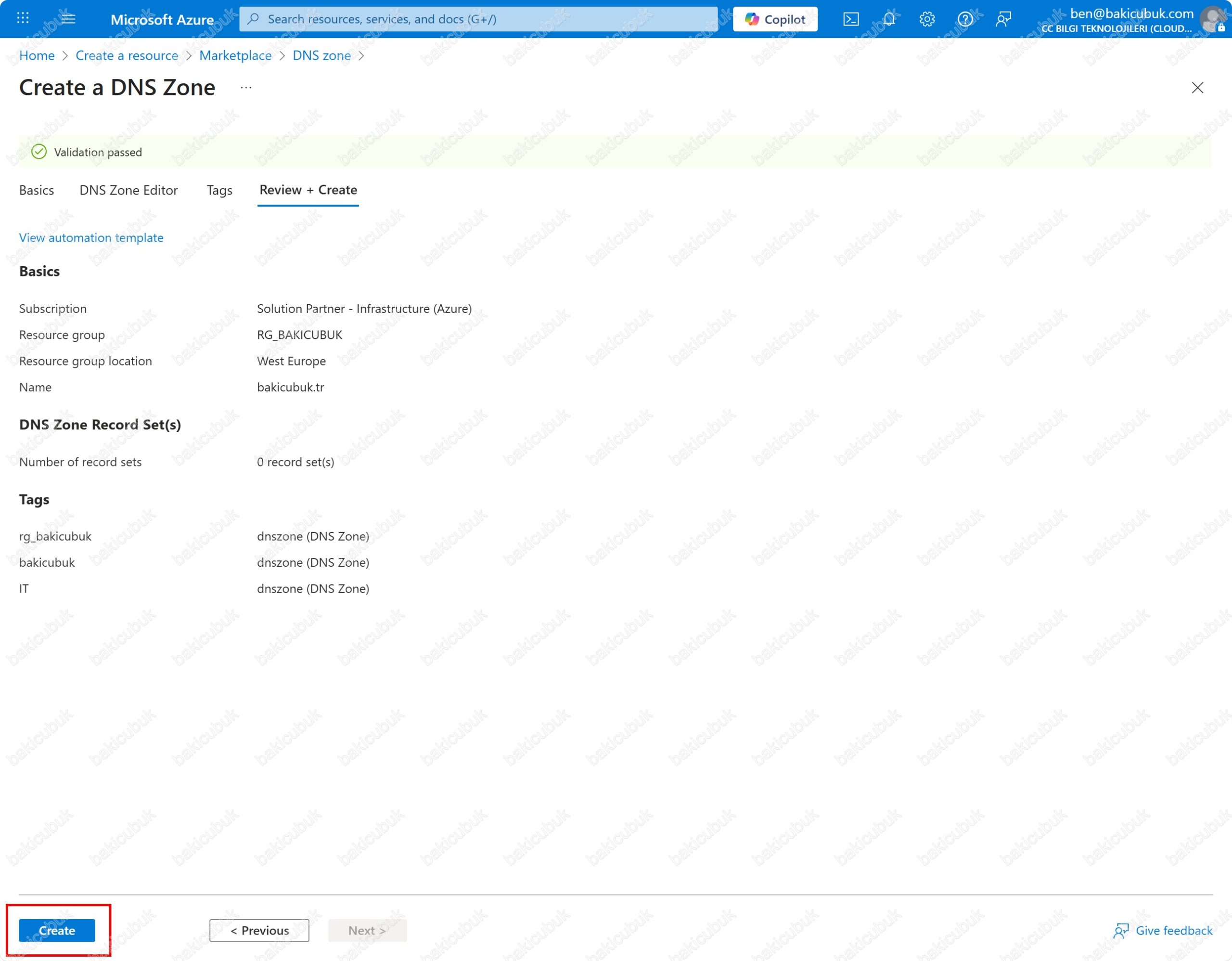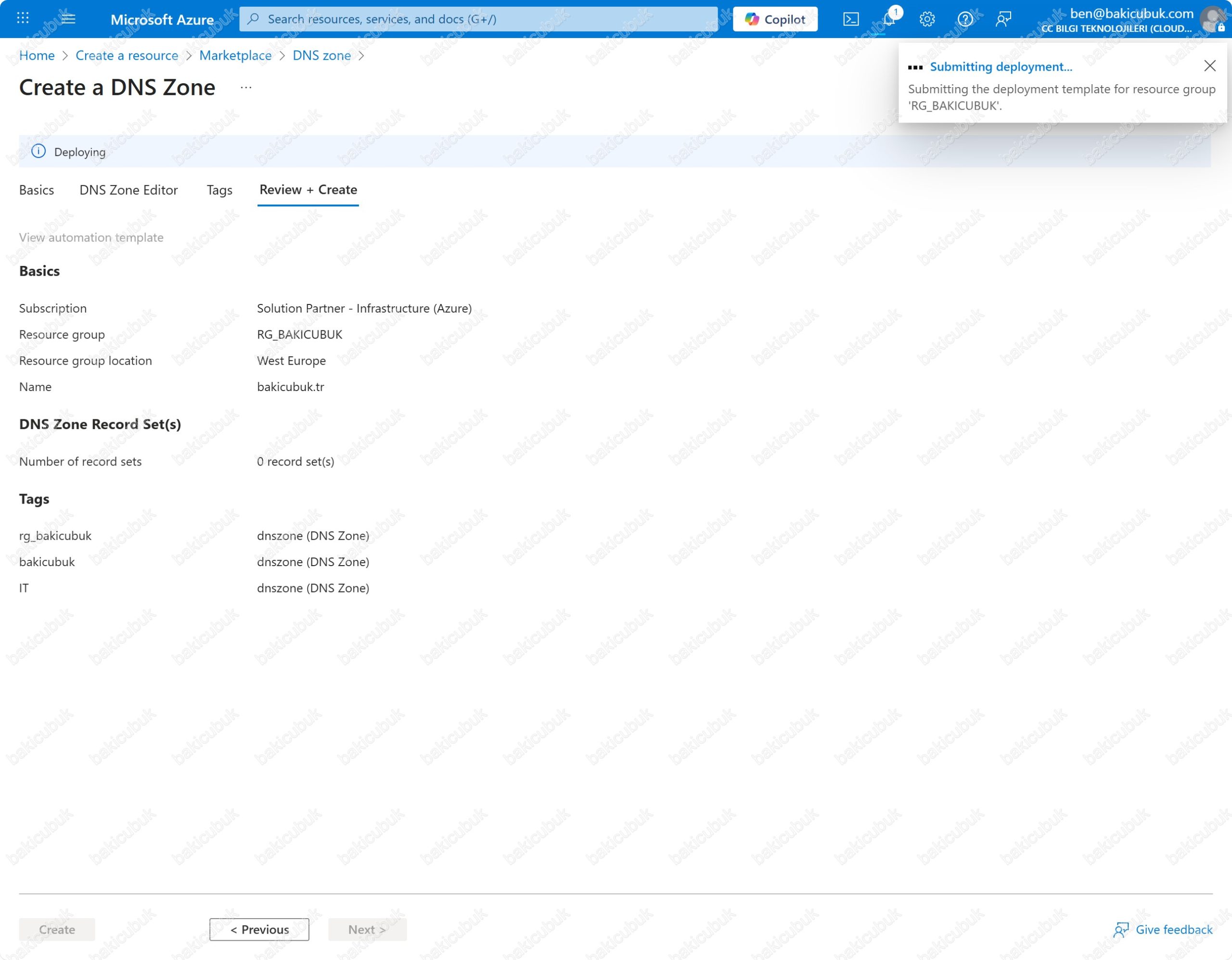 Create a DNS Zone ekranında Review + Create sekmesinde gerekli yapılandırmayı kontrol ettikten sonra Create seçeneği ile bakicubuk.tr alan adı için DNS zone yapılandırmasını başlatıyoruz.