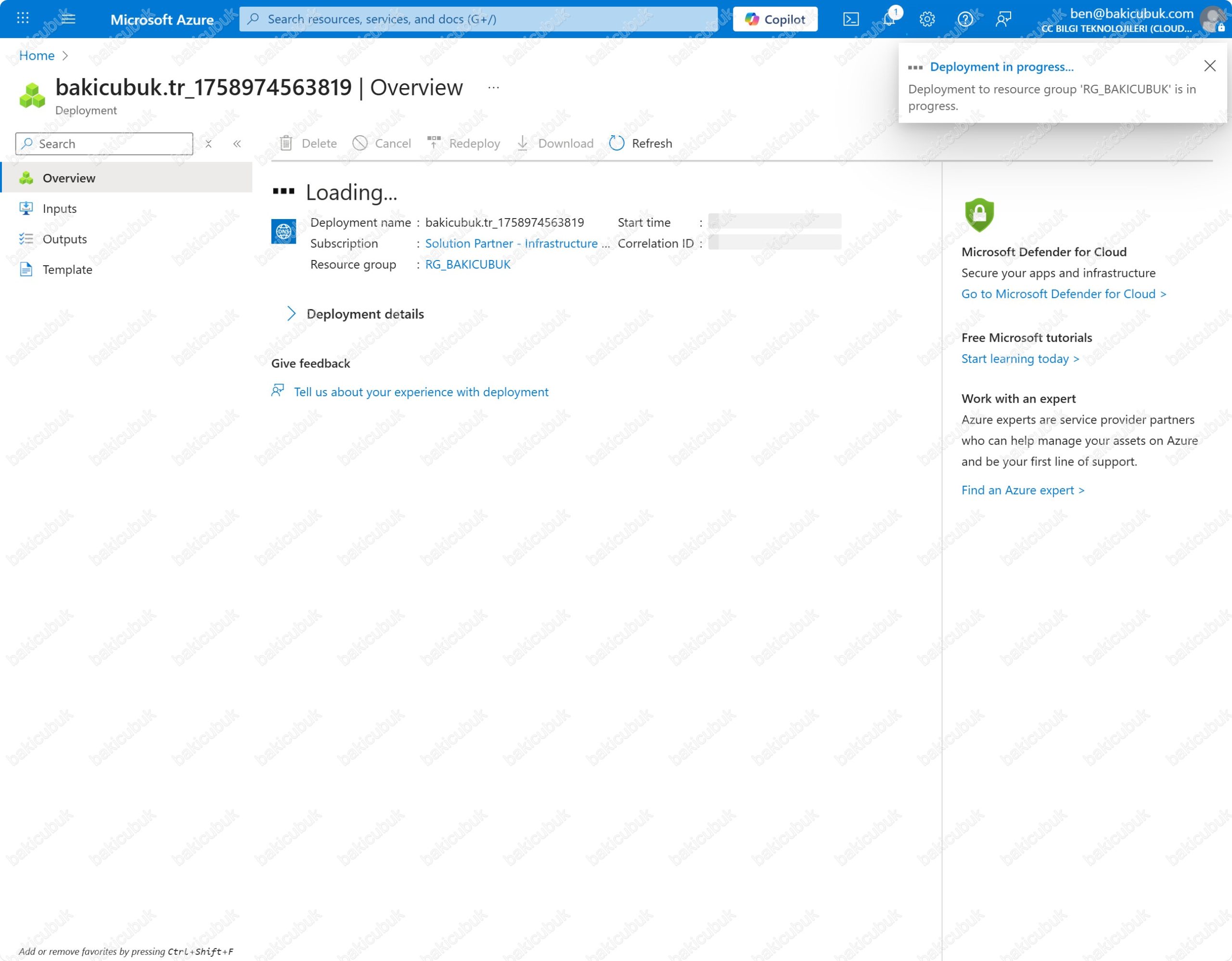 Deployment in progress uyarısını görüyoruz. bakicubuk.tr alan adı için DNS zone oluşturma ve yapılandırma işleminin aktif olarak devam ettiğini, kaynakların dağıtımının sürdüğünü görüyoruz.