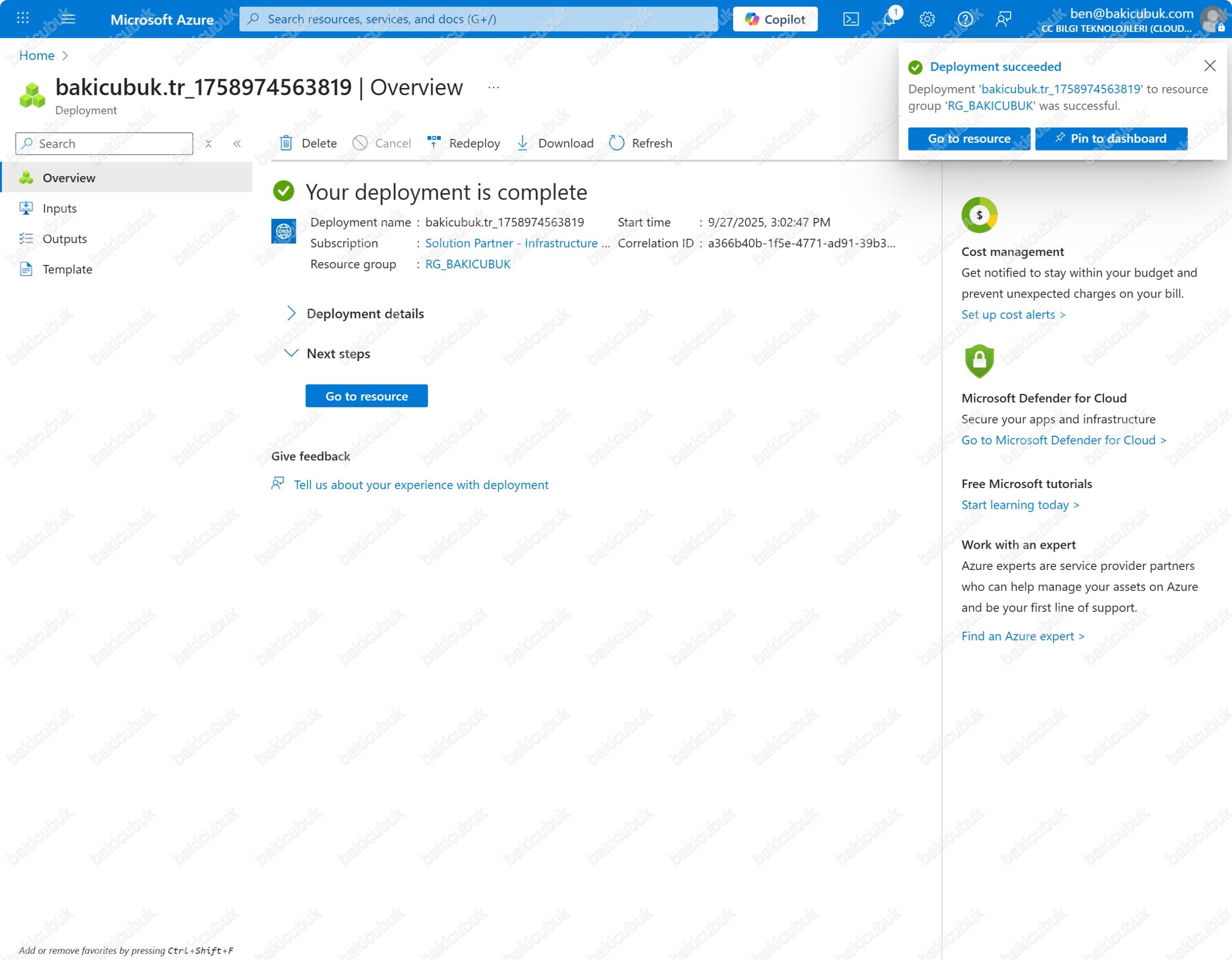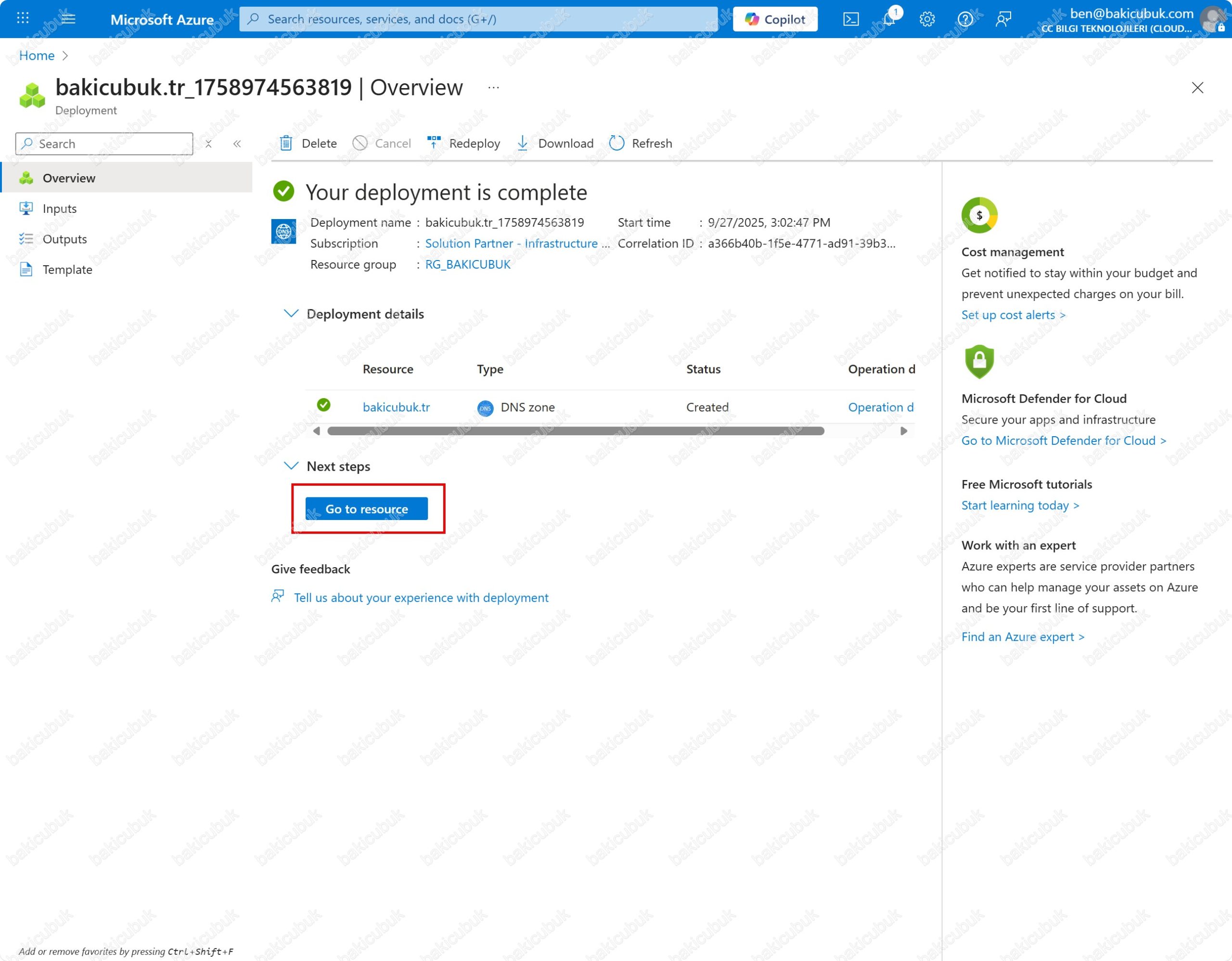Your deployment is complete ekranında Deployment succeeded uyarısını görüyoruz. bakicubuk.tr alan adı için DNS zone oluşturma ve yapılandırma işleminin başarıyla tamamlandığını, tüm kaynakların sorunsuz bir şekilde dağıtıldığını görüyoruz.