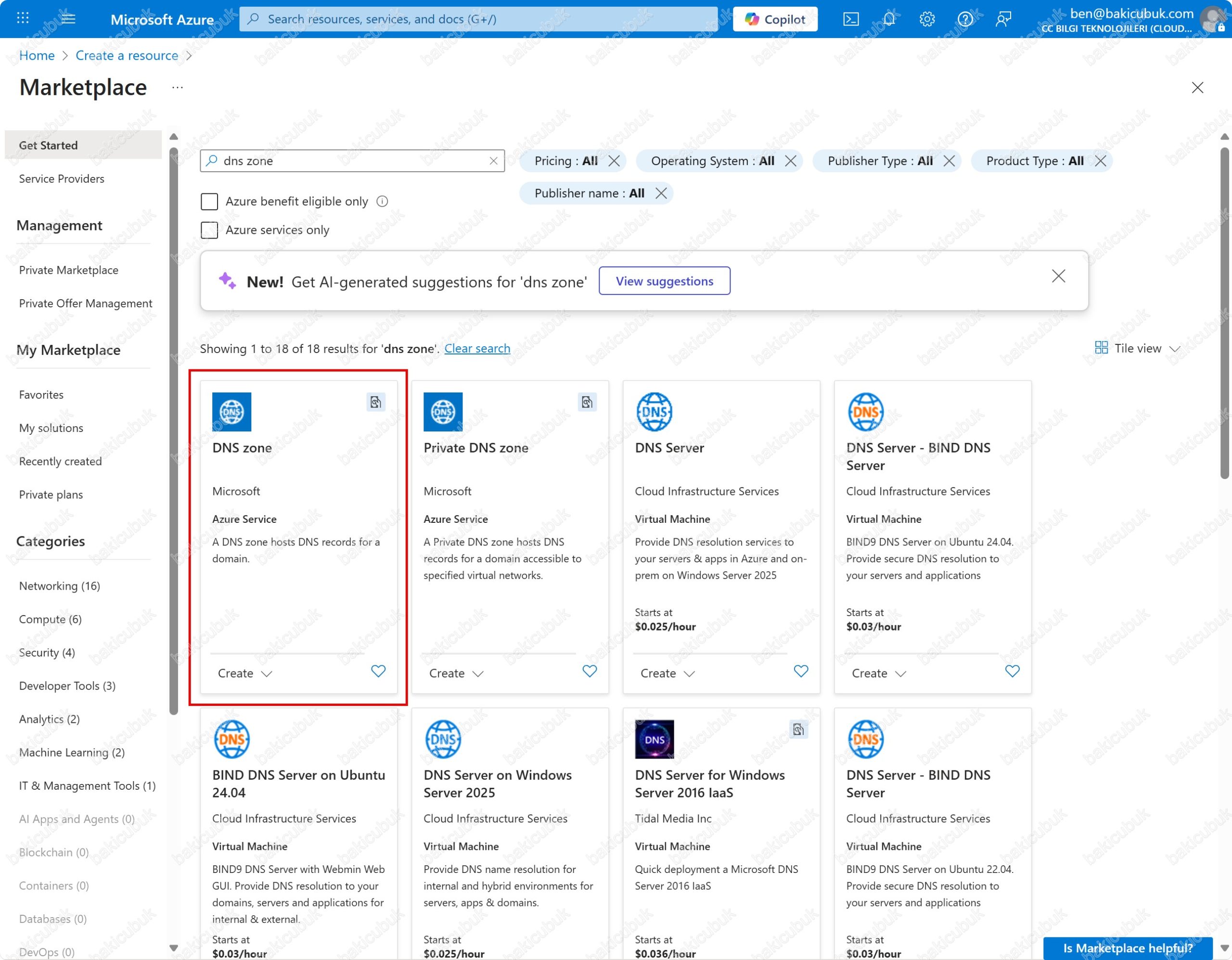 Create a resource ekranında Azure Marketplace menüsünde DNS zone seçeneğini seçiyoruz. bakicubuk.tr isimli alan adının DNS kayıtlarını yapılandırarak yöneteceğimiz için DNS zone seçeneğini seçiyoruz.