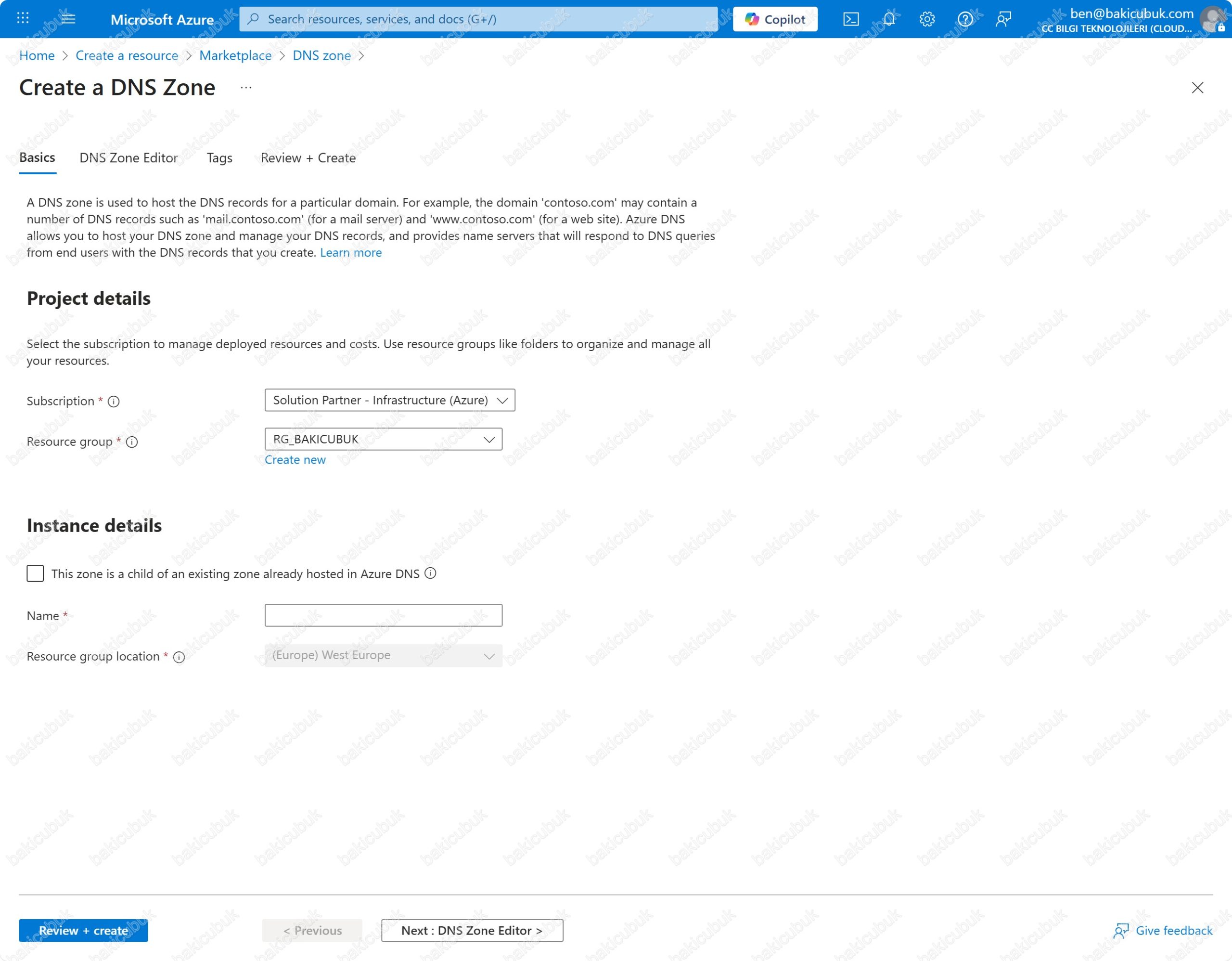 Create a DNS Zone ekranında Basics sekmesinde Name seçeneğini bakicubuk.tr alan adı için yapılandırıyoruz. Farklı bir yapılandırma yapmadan direkt olarak Review + create seçeneği ile bakicubuk.tr alan adının DNS zone oluşturabiliriz.