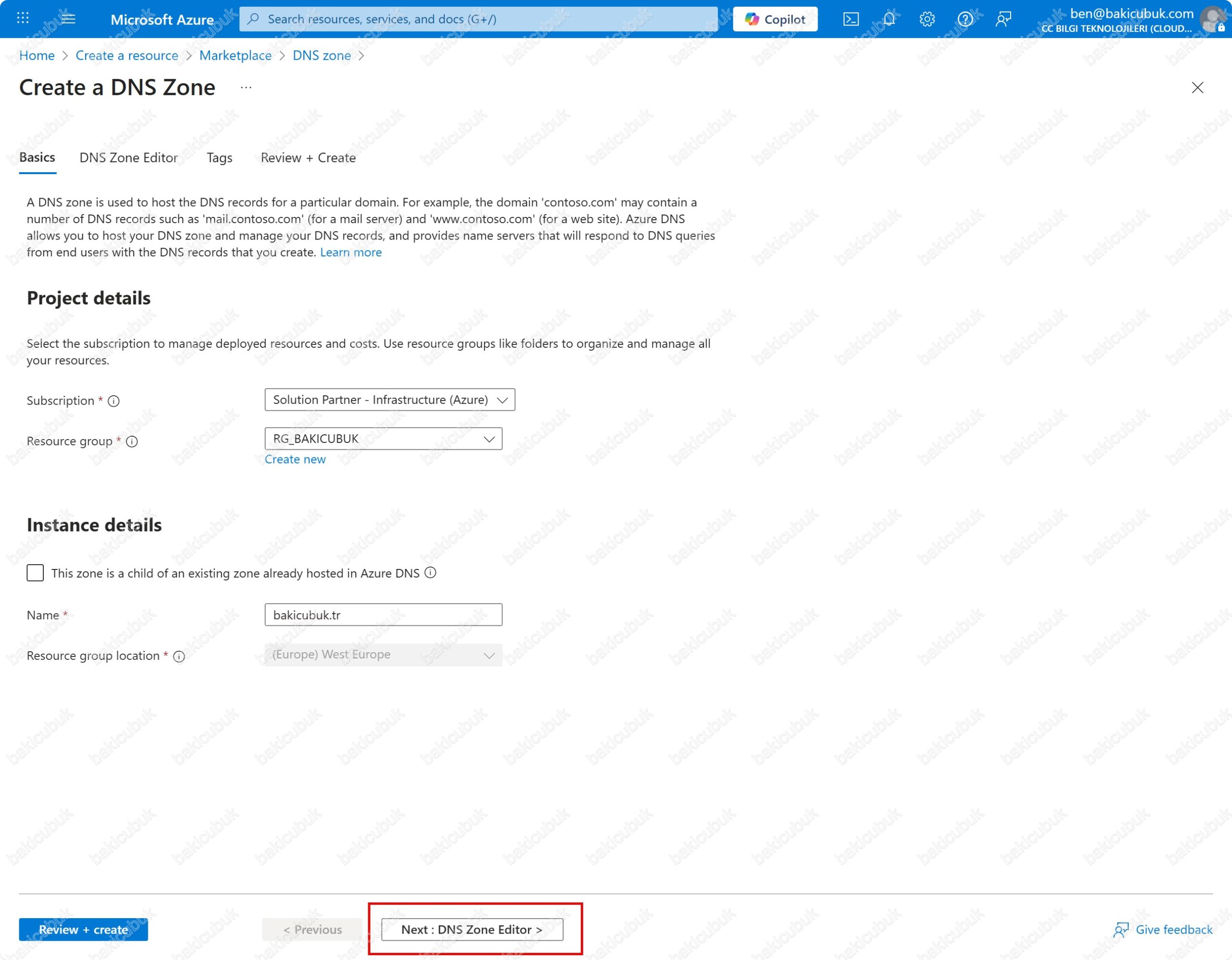 Create a DNS Zone ekranında Basics sekmesinde gerekli yapılandırmayı tamamladıktan sonra Next : DNS Zone Editor seçeneği ile devam ediyoruz.