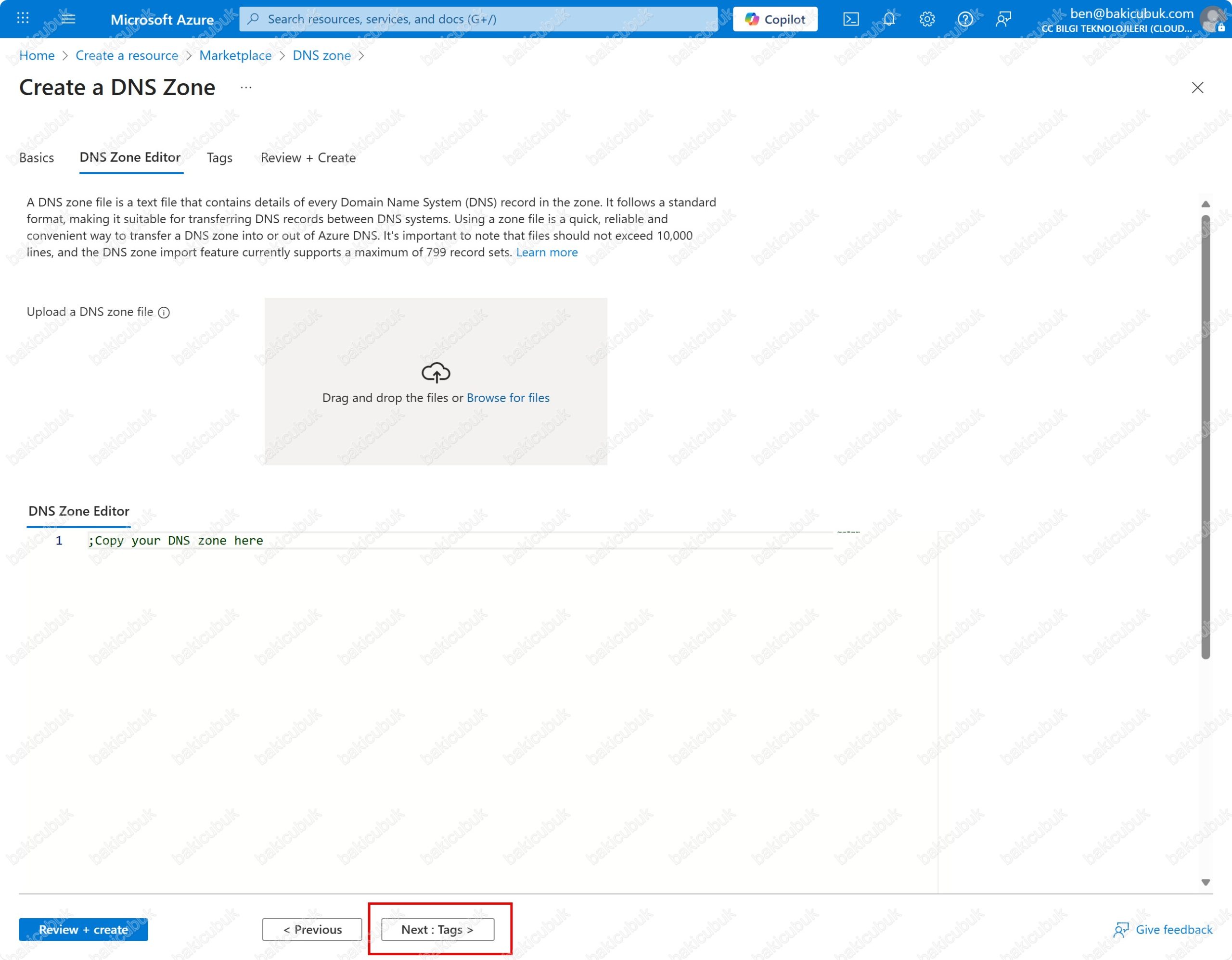 Create a DNS Zone ekranında Tags sekmesinde