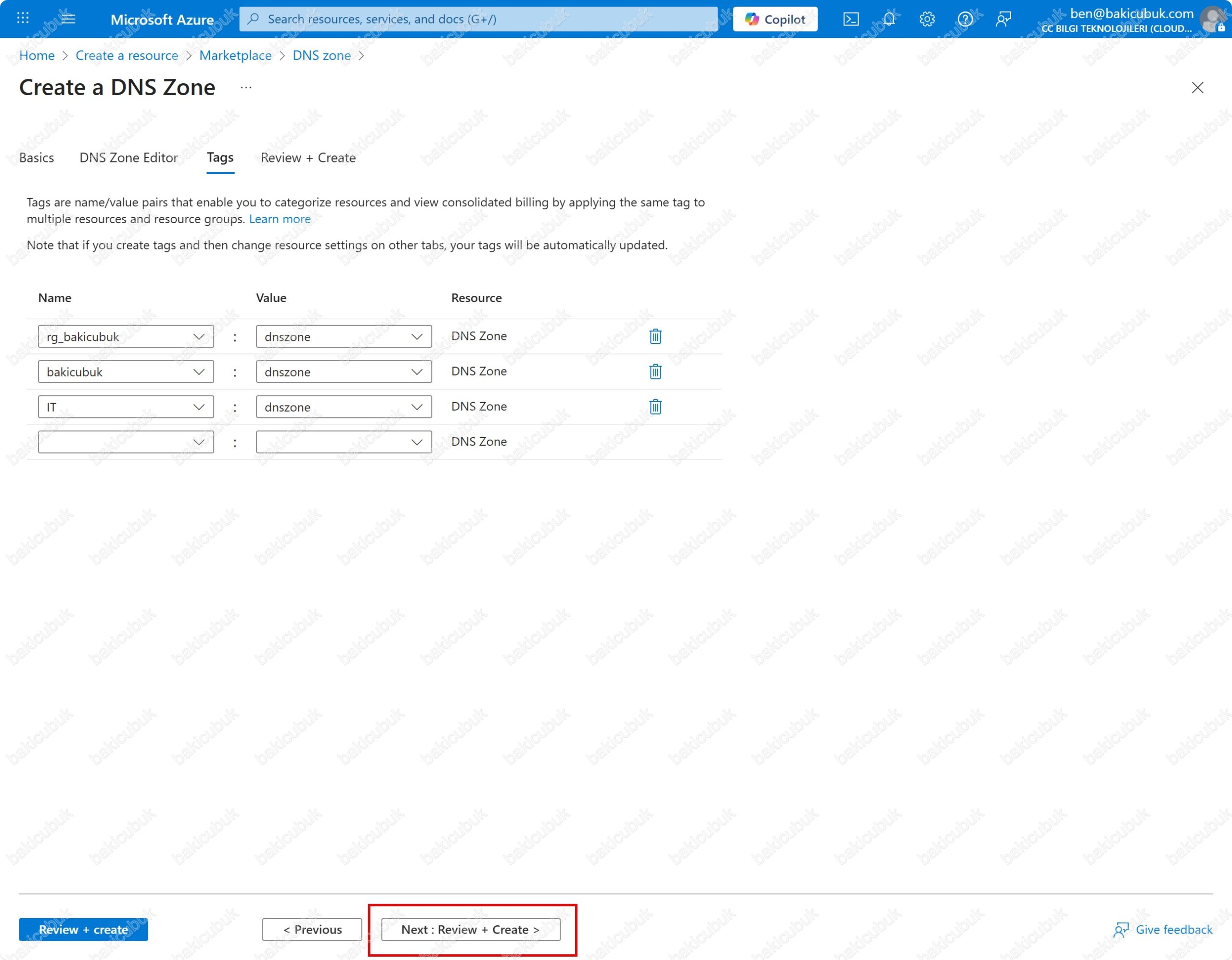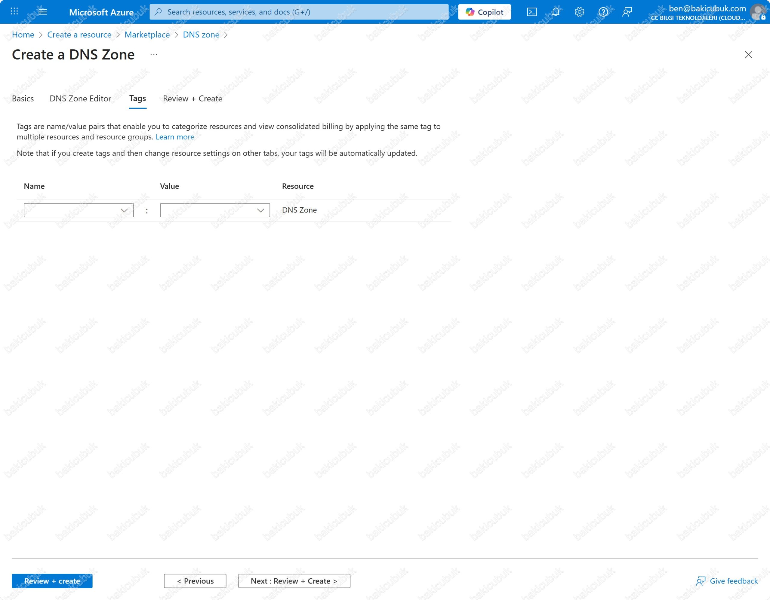Tags: Bir DNS Zone kaynağına eklenebilen Key (Anahtar) ve Value (Değer) seçenekleridir. Azure’daki hemen hemen tüm kaynaklarda olduğu gibi, DNS Zone’larda da yönetimsel, operasyonel veya maliyet takibi amacıyla kullanılabilirler. Özetle, Tags seçeneği DNS zone kaynaklarını kategorize etmek, maliyet takibini kolaylaştırmak ve yönetim politikaları uygulamak için kullanılan meta verileridir.