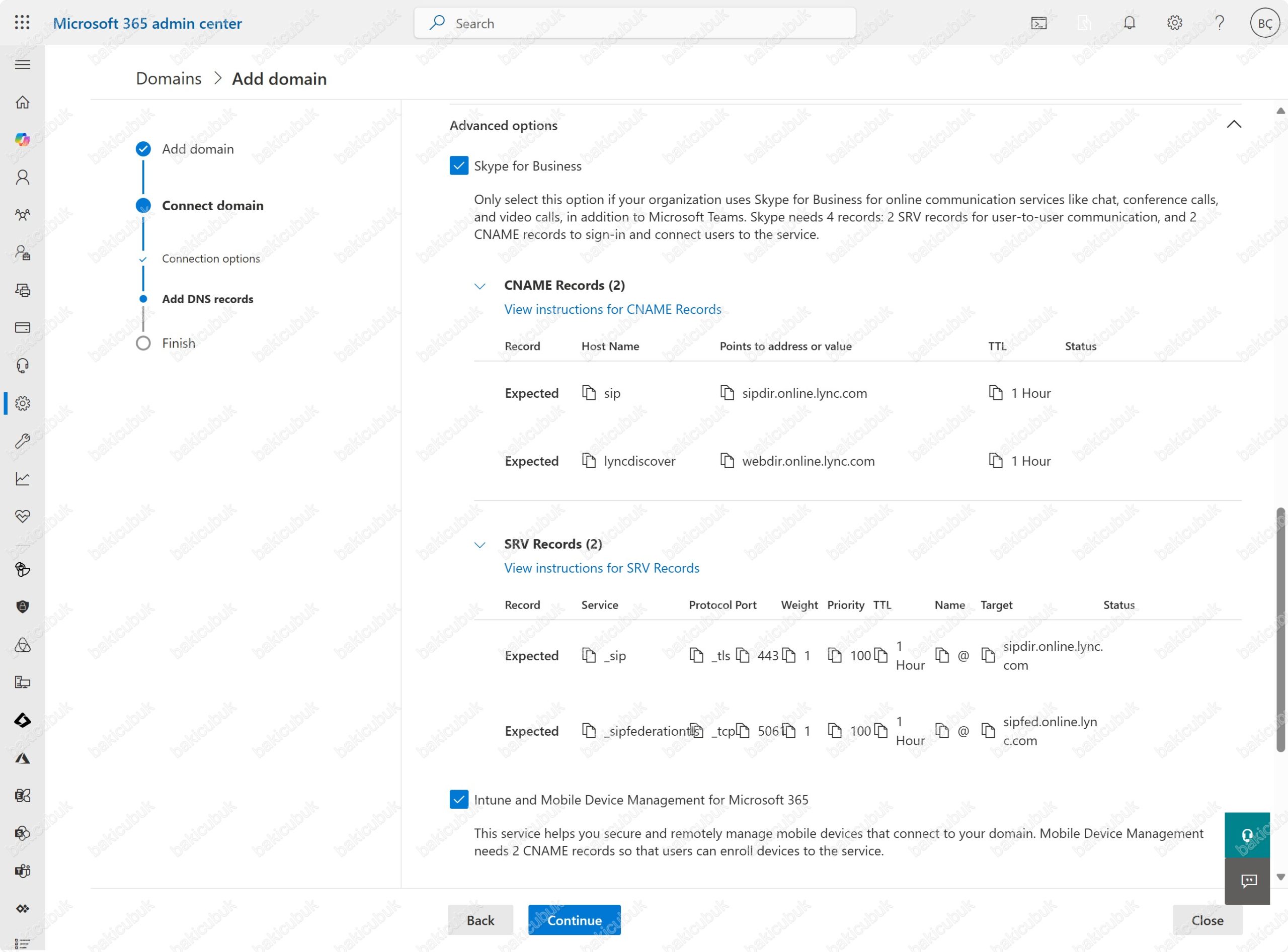 Add DNS records ekranında Intune and Mobile Device Management for Microsoft 365 seçeneği altında CNAME Records bölümü altında 2 adet CNAME (Canonical Name) DNS kayıtlarını oluşturduktan sonra Continue seçeneğine tıklayarak kontrol edebilirsiniz.