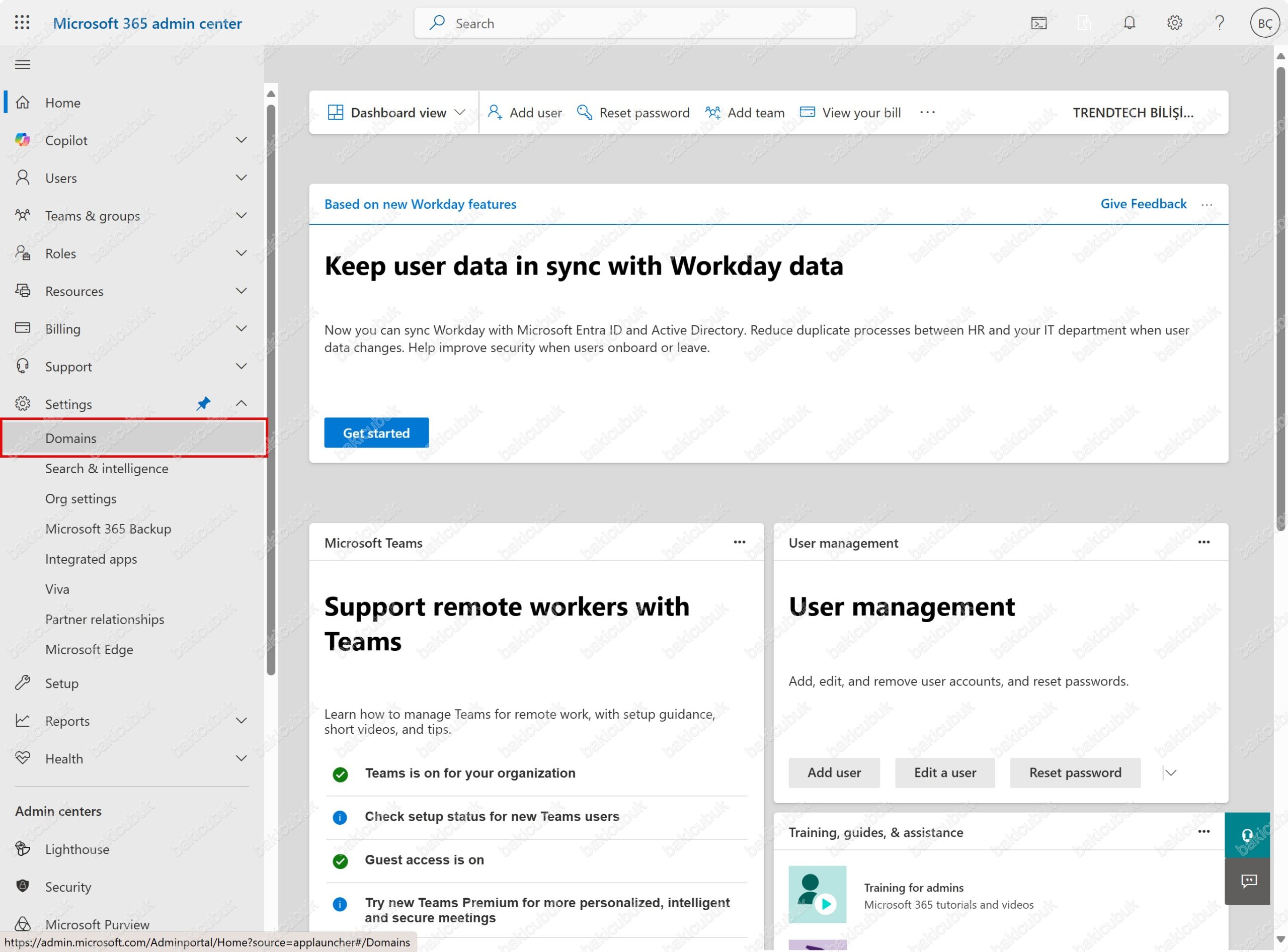 Microsoft 365 admin center konsolunda Settings menüsü altında bulunan Domains seçeneğine tıklıyoruz.