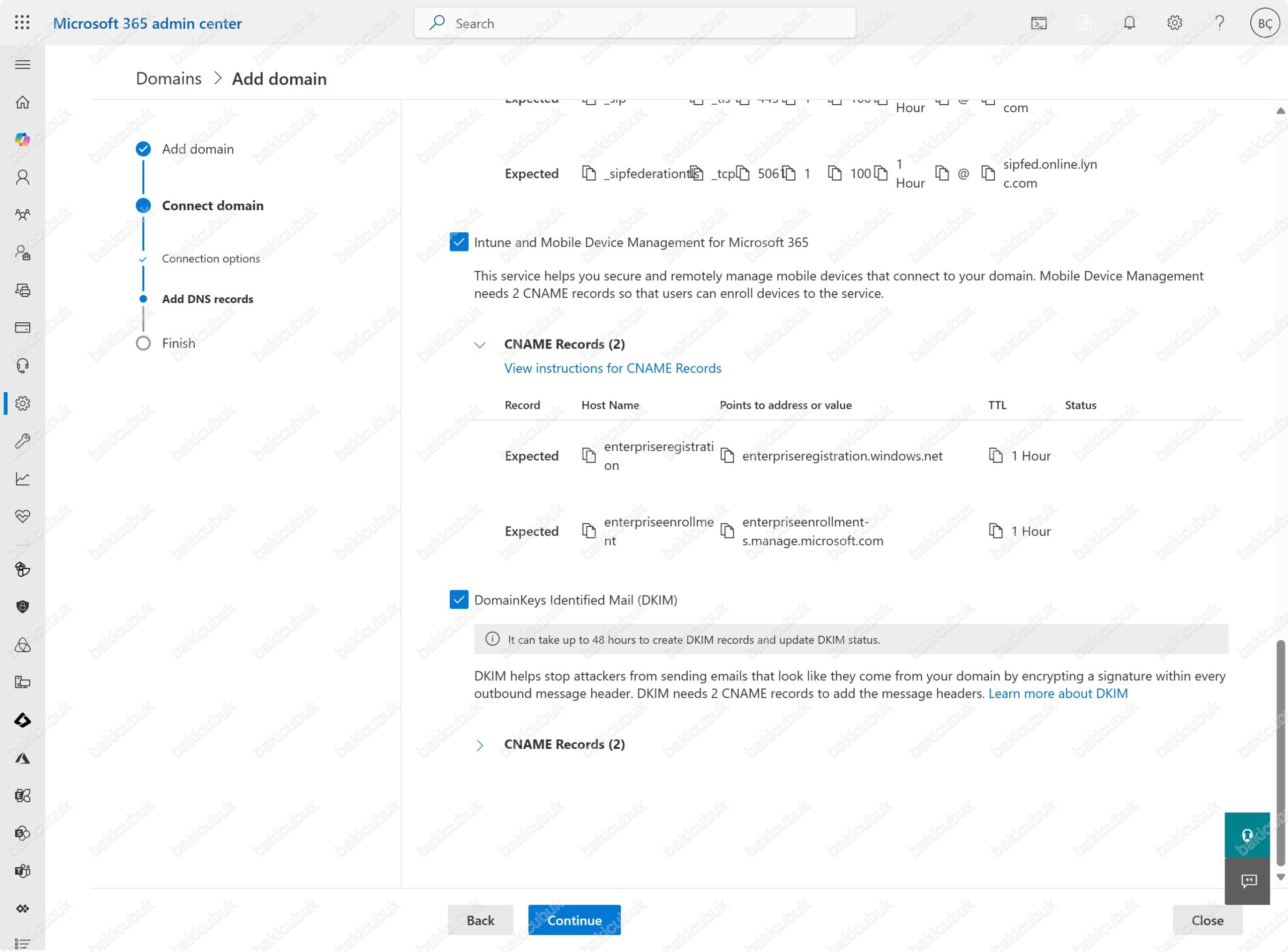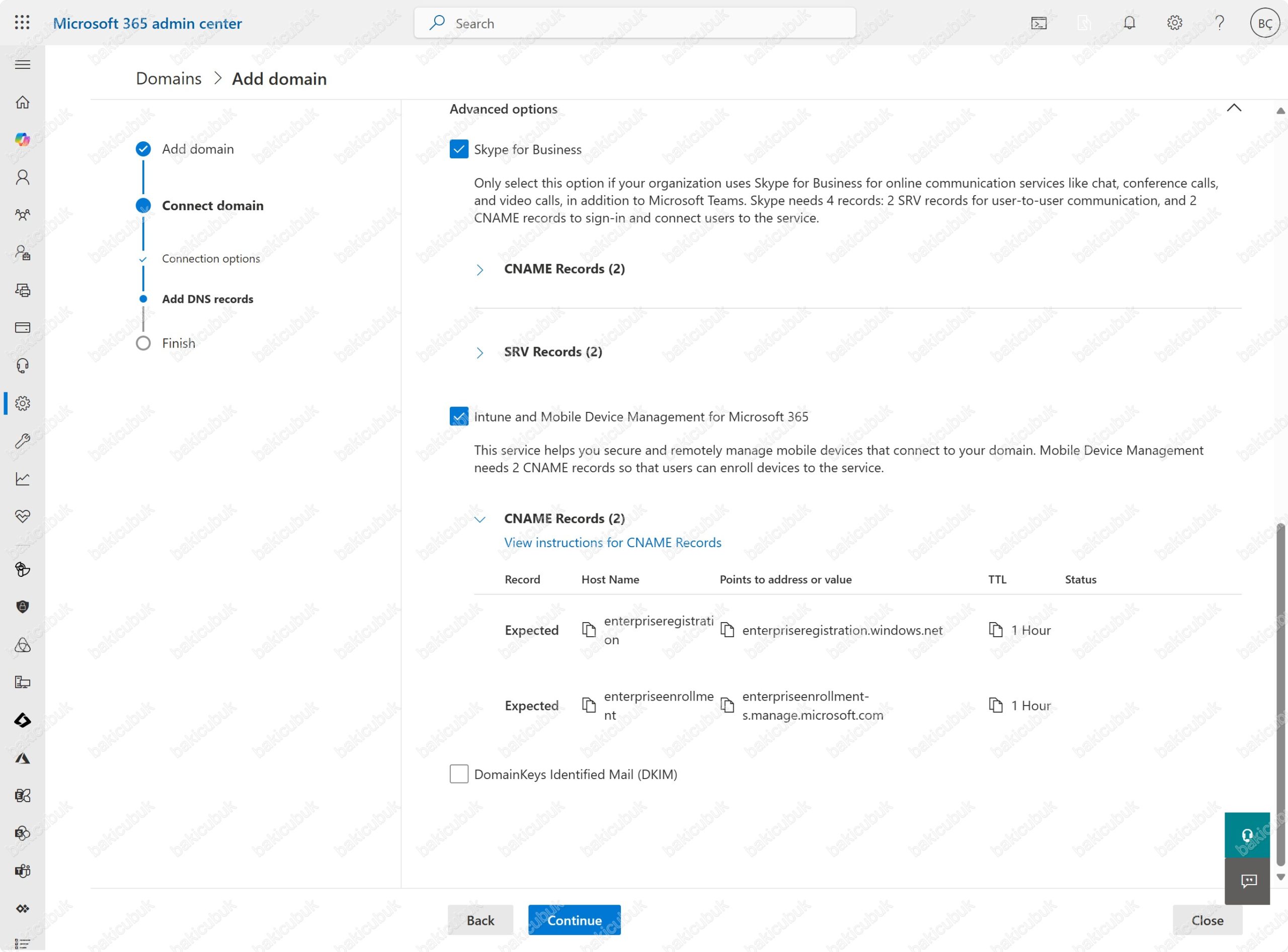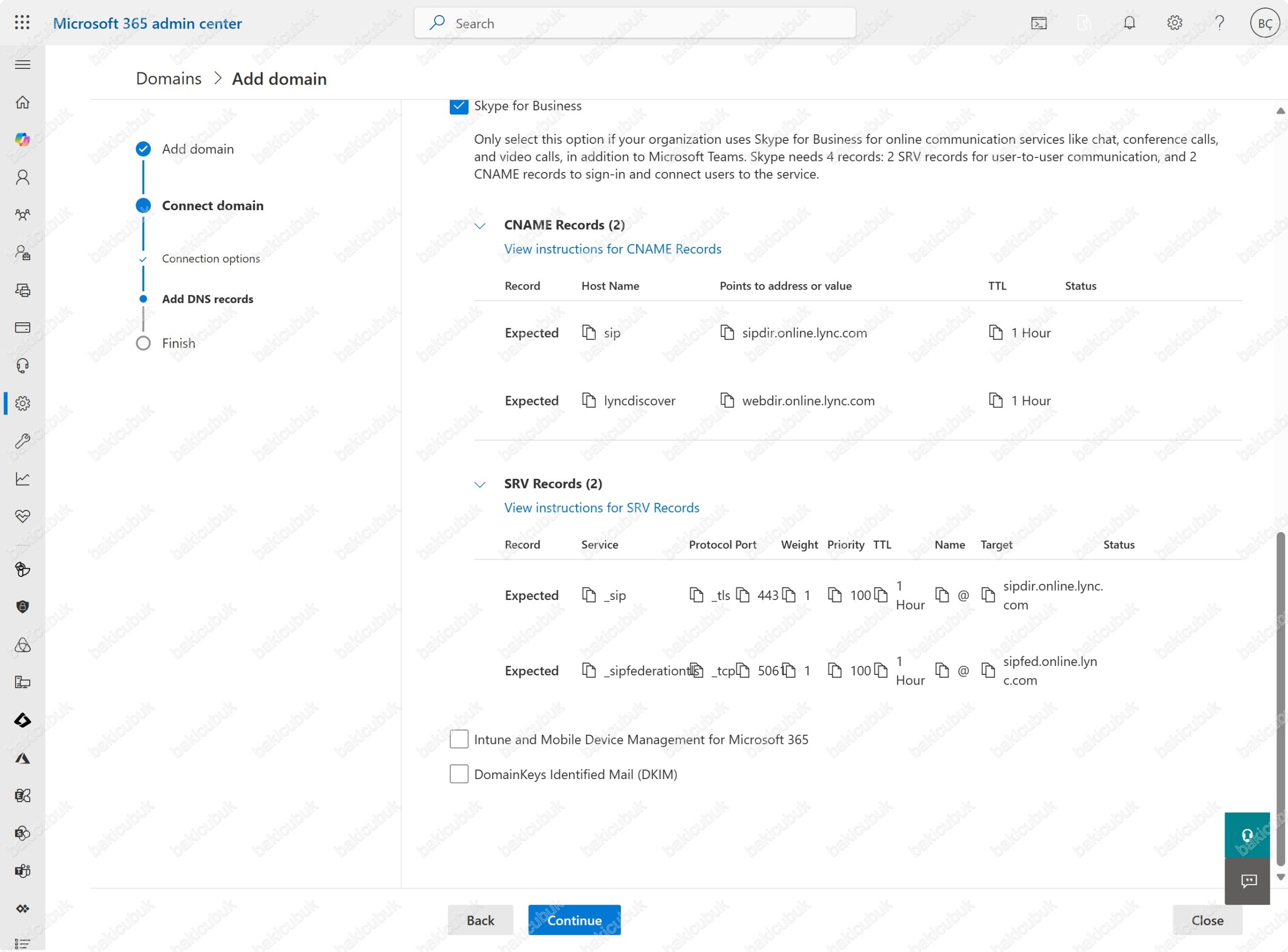 Add DNS records ekranında Exchange, Exchange Online Protection, Skype for Business (Microsoft Teams), Intune and Mobile Device Management for Microsoft 365 ve DomainKeys Identified Mail (DKIM) servisleri için farklı DNS kayıtları tanımlanması gerekir. Bu kayıtlar olmadan servislerin doğru çalışması, e-postaların teslim edilmesi ya da cihaz yönetimlerinin yapılması mümkün değildir.