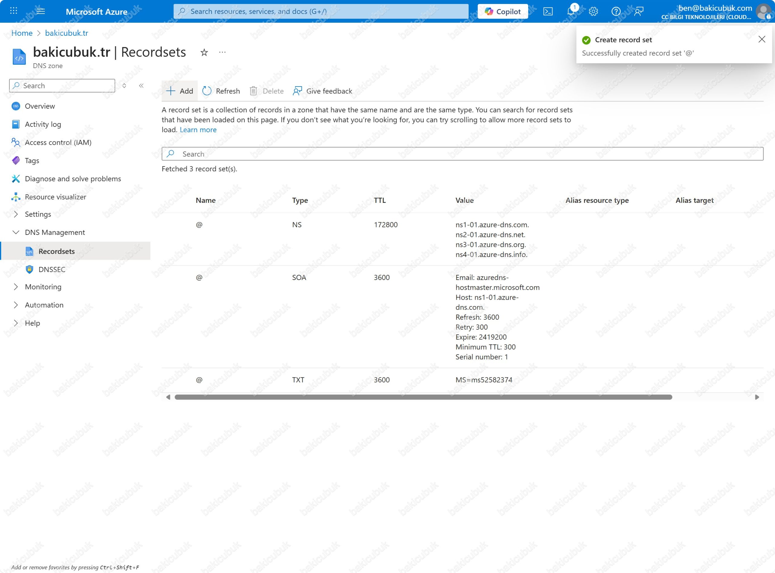 Recordsets ekranında bakicubuk.tr alan adının Azure DNS Zone üzerinde TXT (Text Record) DNS kaydının oluşturulduğu uyarısını görüyoruz.