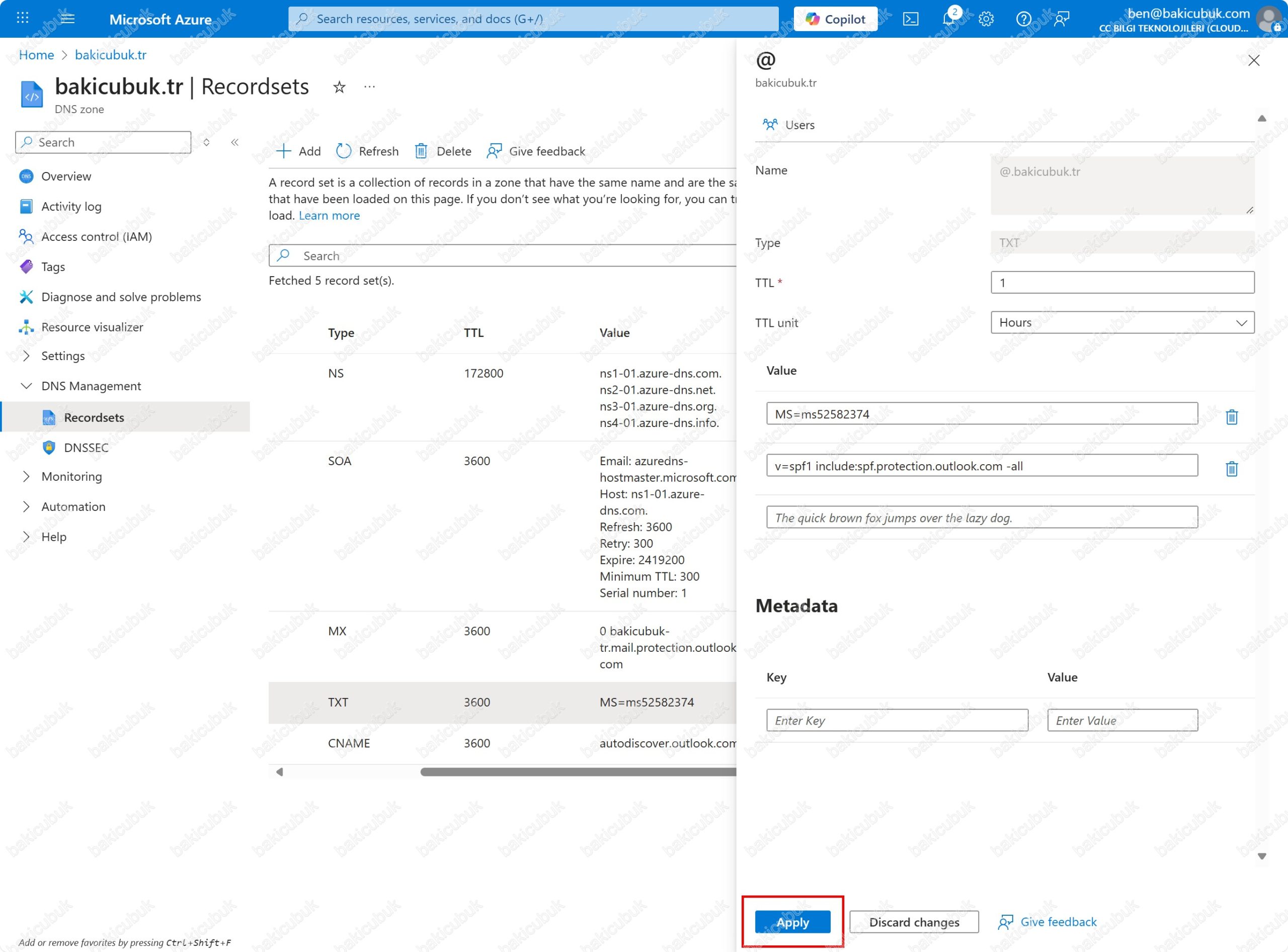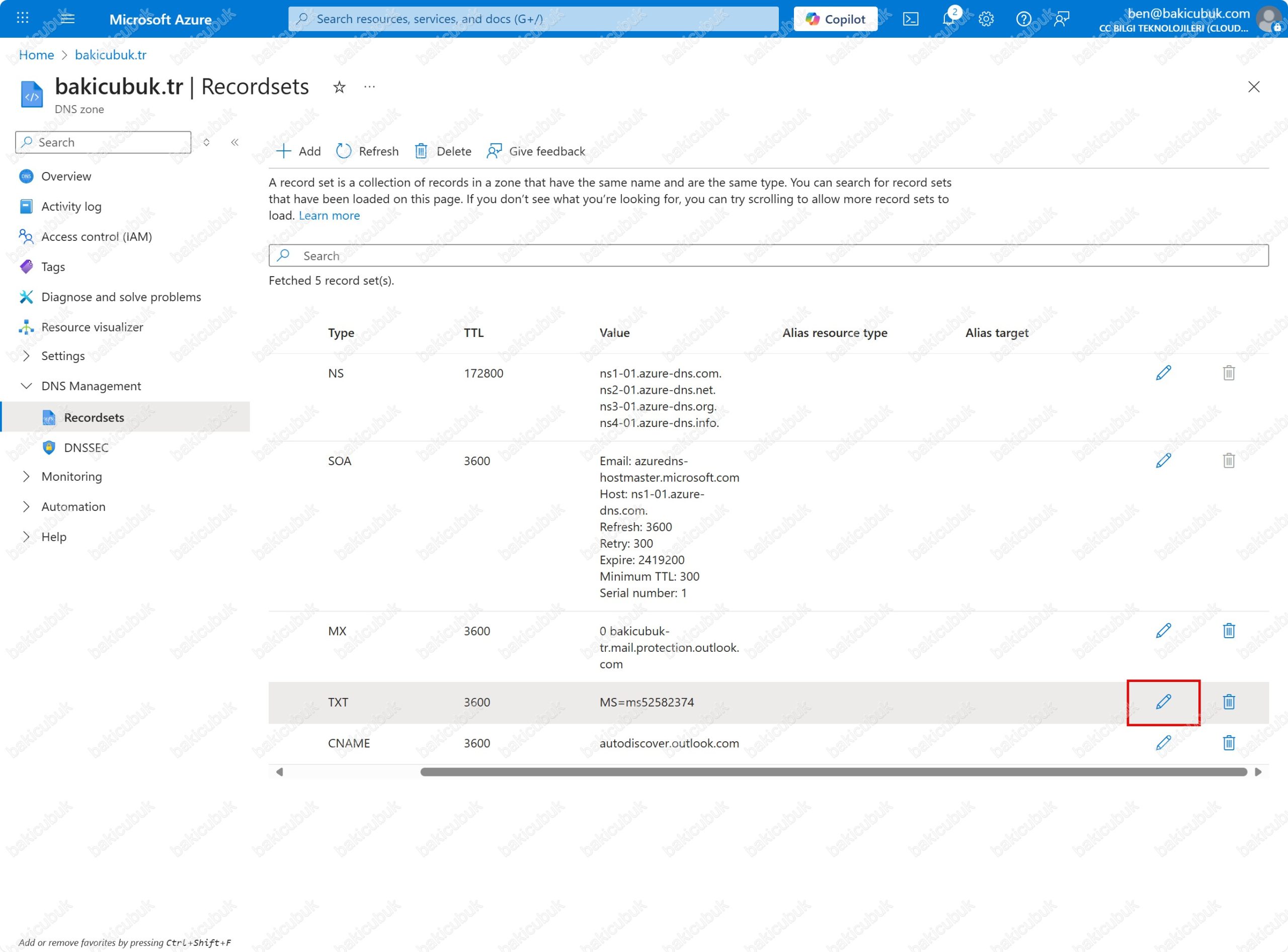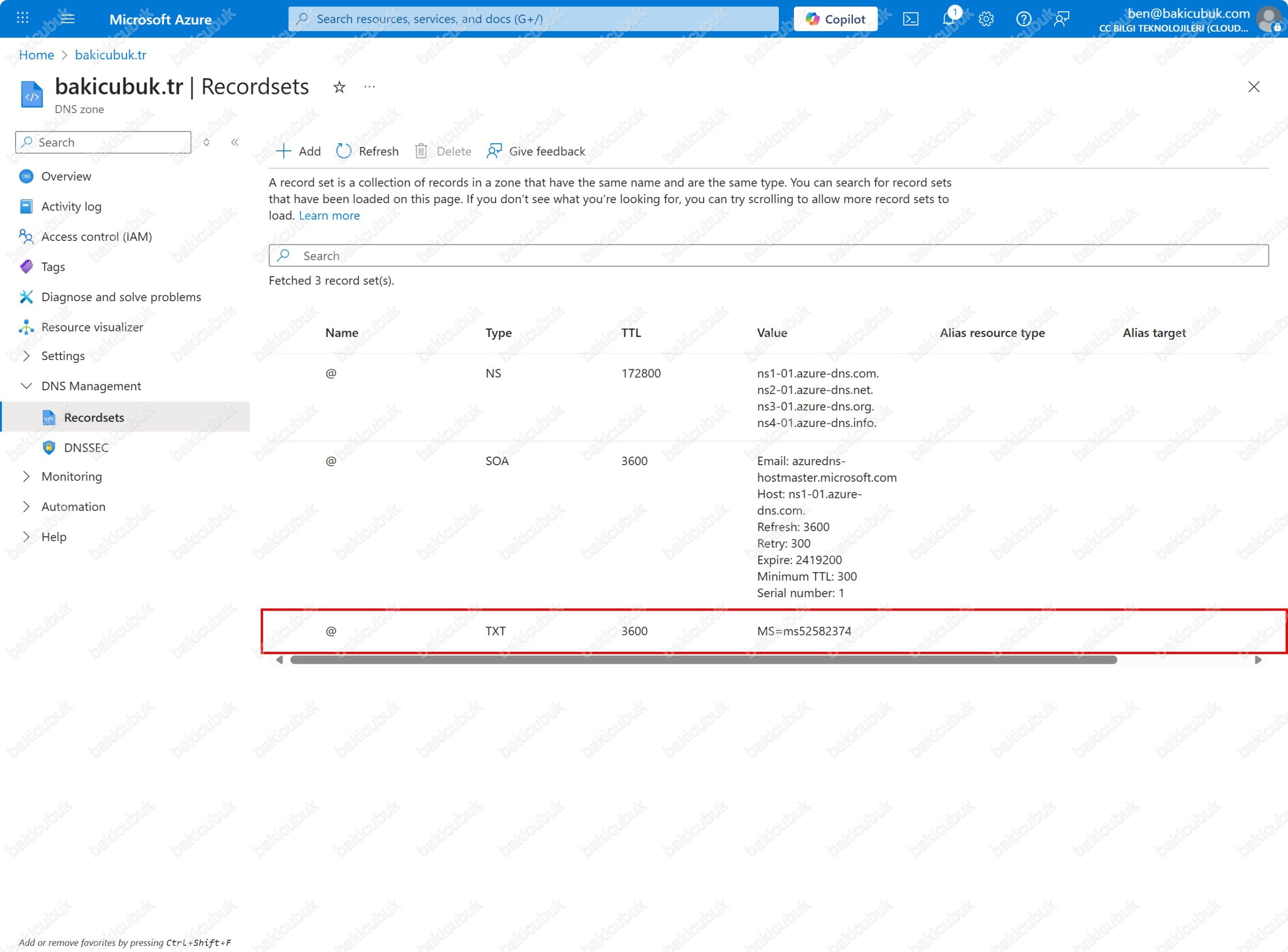 Recordsets ekranında bakicubuk.tr alan adının Azure DNS Zone üzerinde TXT (Text Record) DNS kaydının oluşturulduğunu görüyoruz.