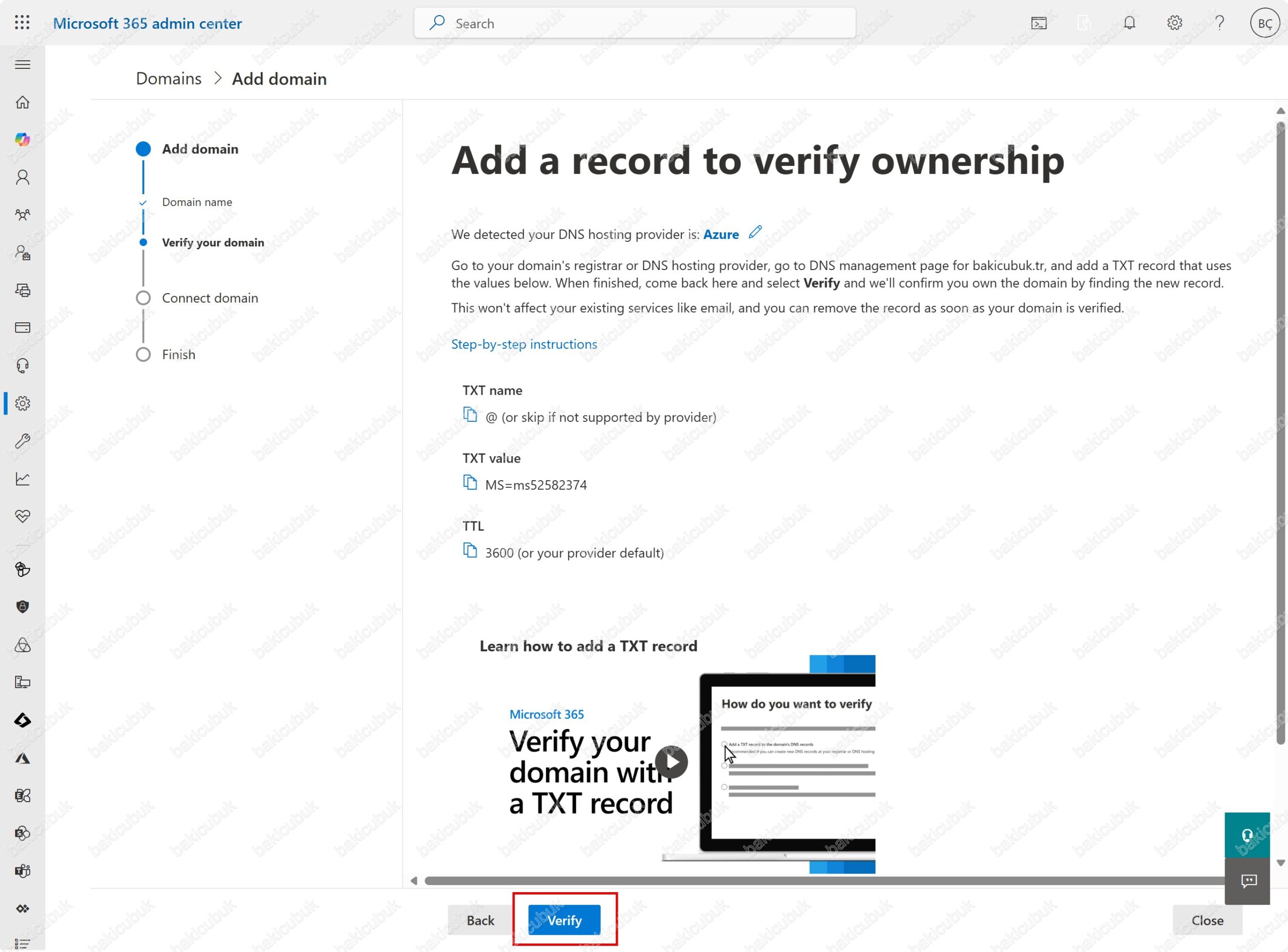 Add a record to verify ownership ekranında TXT name, TXT value ve TTL bölümlerindeki değerler ile bakicubuk.tr alan adının Azure DNS Zone üzerinde TXT (Text Record) DNS kaydını oluşturduktan sonra Verify seçeneğine tıklayarak doğrulama işlemini gerçekleştiriyoruz.