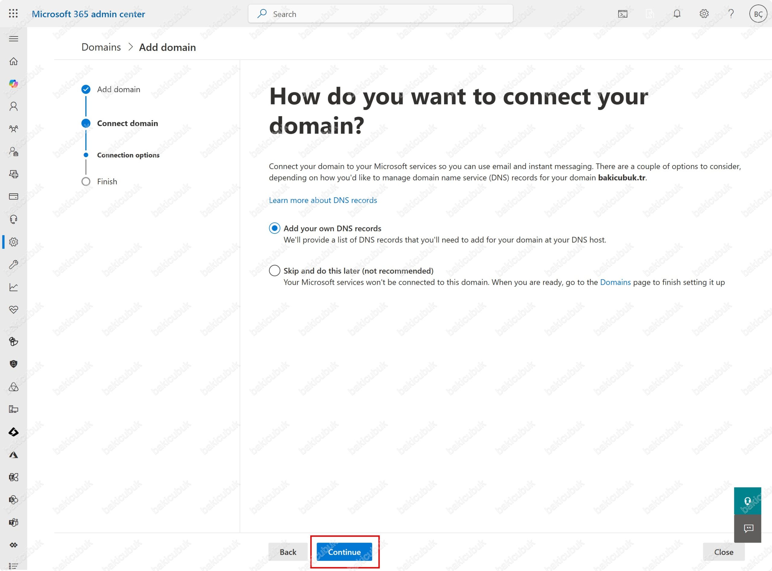 • Skip and do this later (not recommended) seçeneği ise DNS kayıtlarının eklenmesini ertelemenize imkan tanır. Ancak bu durumda e-posta, Teams veya diğer hizmetler tam olarak çalışmaz, hatalarla karşılaşabilirsiniz. Bu nedenle üretim ortamlarında bu seçeneğin tercih edilmesi tavsiye edilmez.