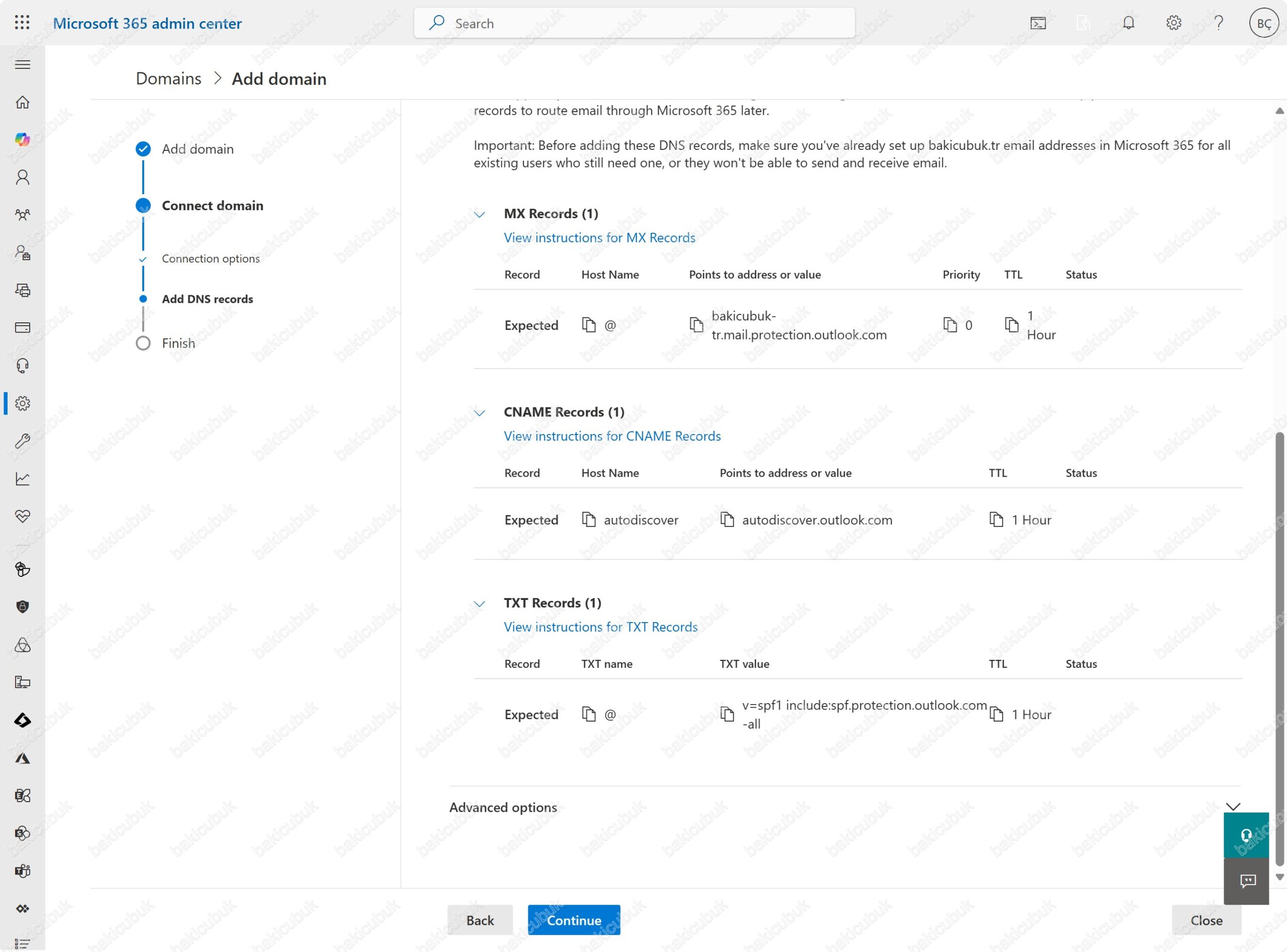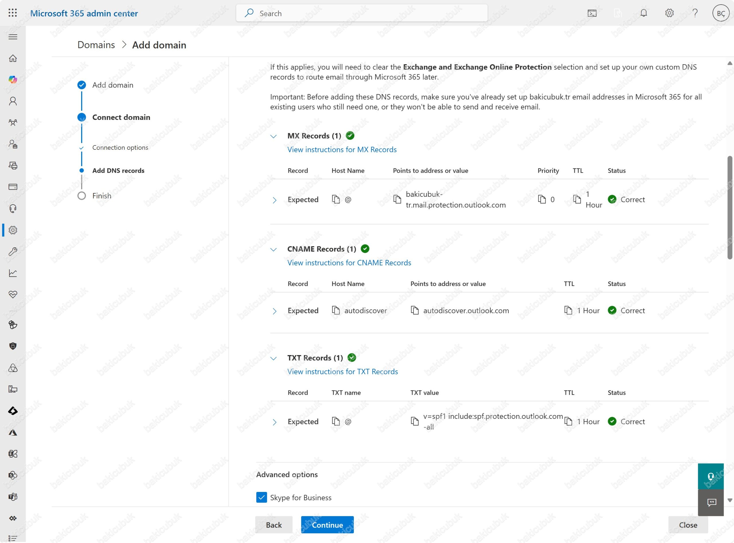Add DNS records ekranında Advanced options seçeneği altında Skype for Business (Microsoft Teams), Intune and Mobile Device Management for Microsoft 365 ve DomainKeys Identified Mail (DKIM) servisleri seçmeden devam edebilir. Skype for Business (Microsoft Teams), Intune and Mobile Device Management for Microsoft 365 ve DomainKeys Identified Mail (DKIM) servislerini sonra kullanmak istediğinizde bakicubuk.tr alan adının Azure DNS Zone üzerinde tekrar yapılandırabilirsiniz.
