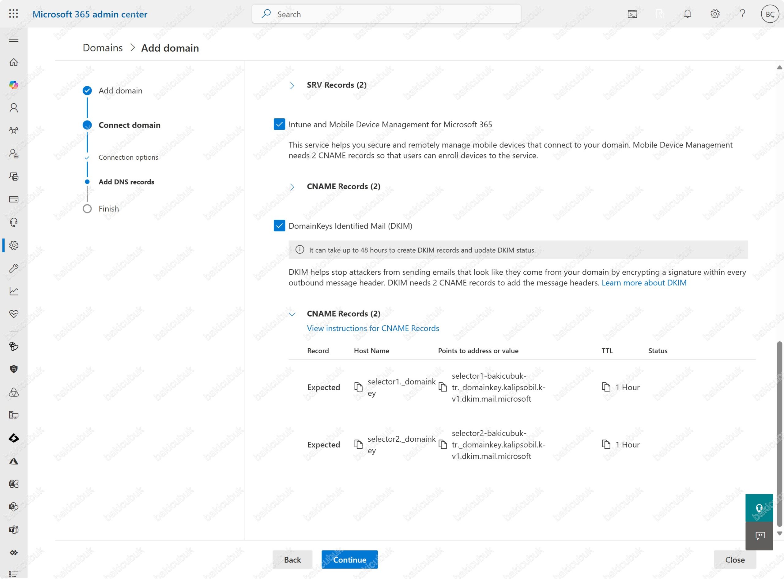 Add DNS records ekranında DomainKeys Identified Mail (DKIM) seçeneği altında CNAME Records bölümü altında 2 adet CNAME (Canonical Name) DNS kayıtlarını oluşturduktan sonra Continue seçeneğine tıklayarak kontrol edebilirsiniz.