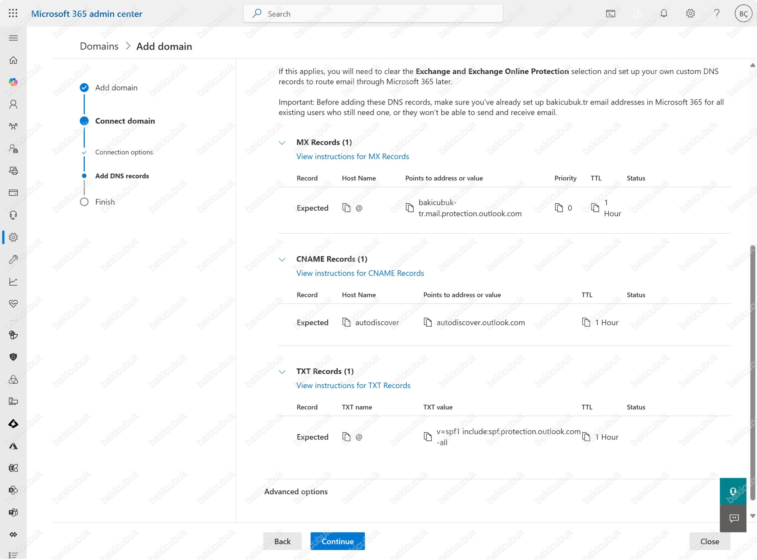 Add DNS records ekranında Exchange, Exchange Online Protection seçeneği altında MX Records, CNAME Records ve TXT records bölümü altında bulunan 1 adet MX (Mail Exchange), 1 adet CNAME (Canonical Name) ve 1 adet TXT (Text Record) DNS kayıtlarını oluşturduktan sonra Continue seçeneğine tıklayarak kontrol edebilirsiniz.