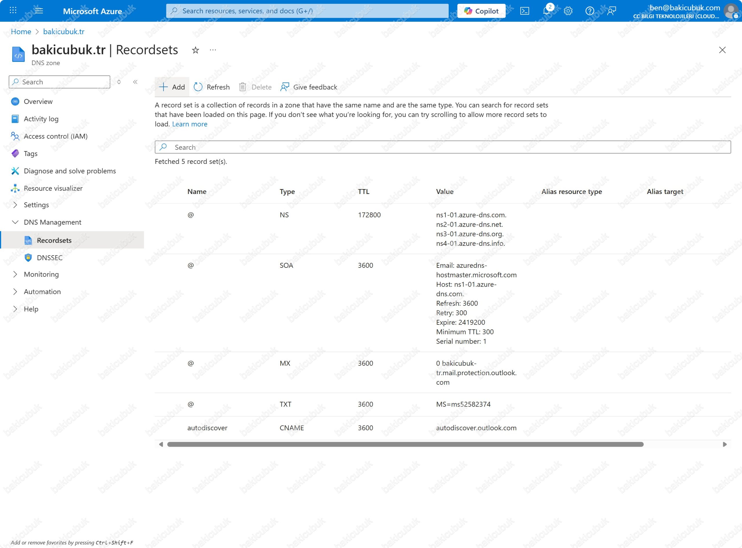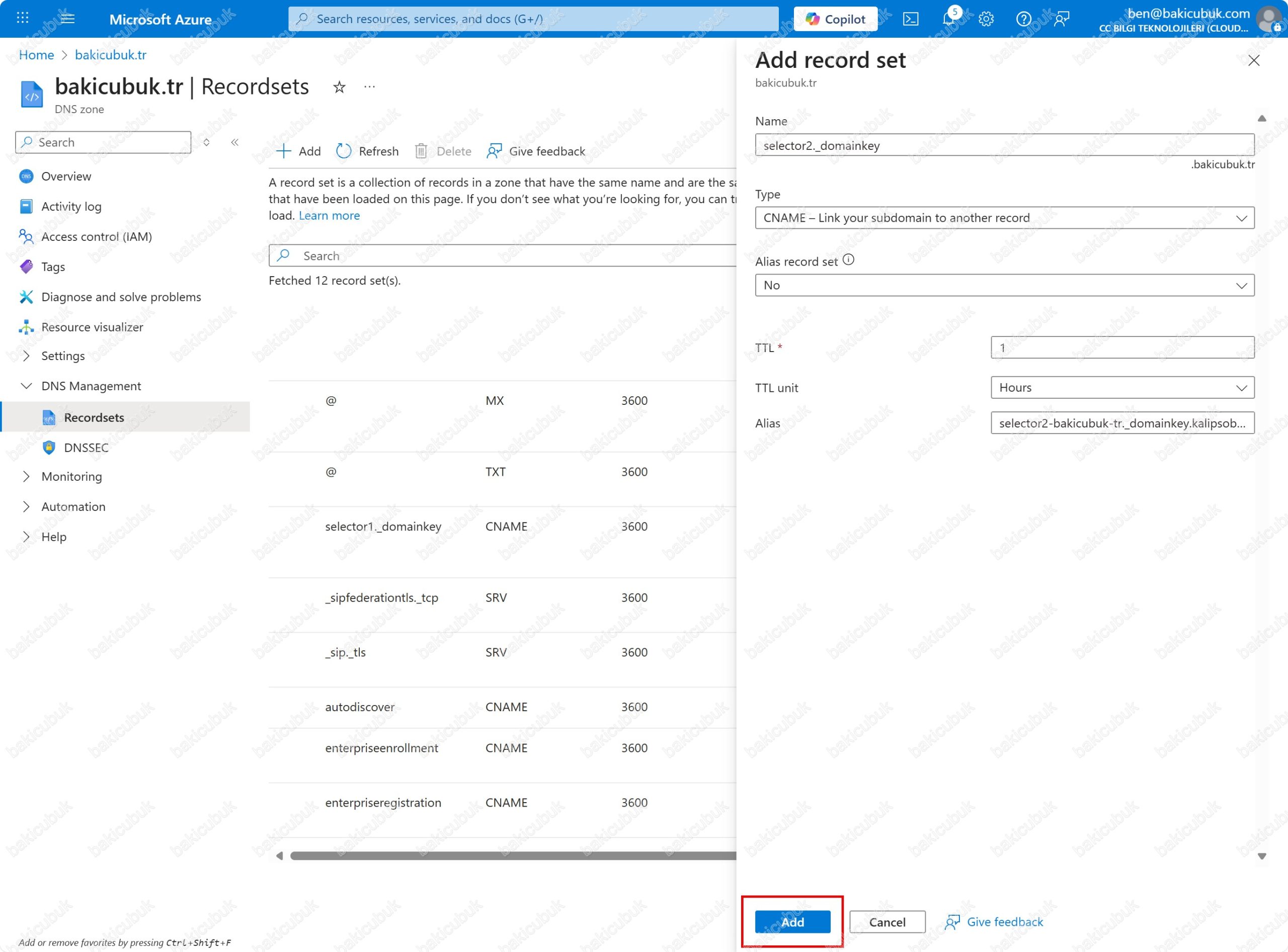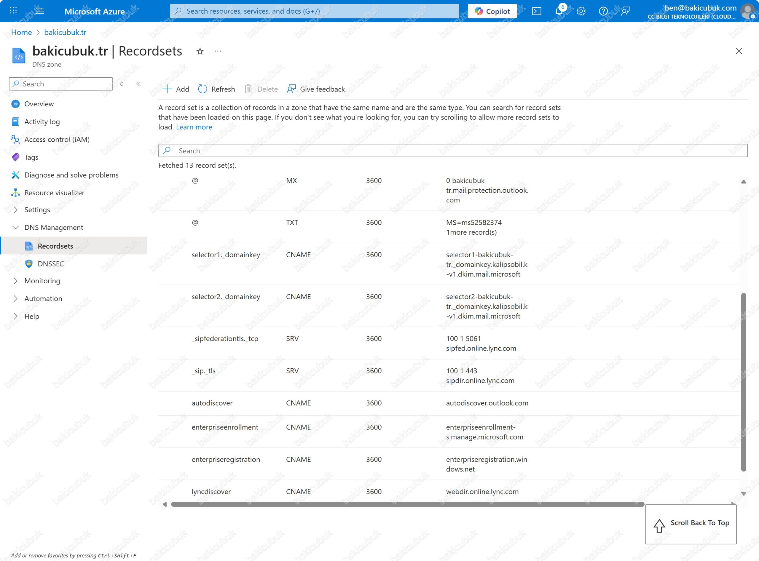 Recordsets ekranında bakicubuk.tr alan adının Azure DNS Zone üzerinde DomainKeys Identified Mail (DKIM) seçeneği altında CNAME Records bölümü altında 2 adet CNAME (Canonical Name) DNS kaydının oluşturulduğunu görüyoruz.