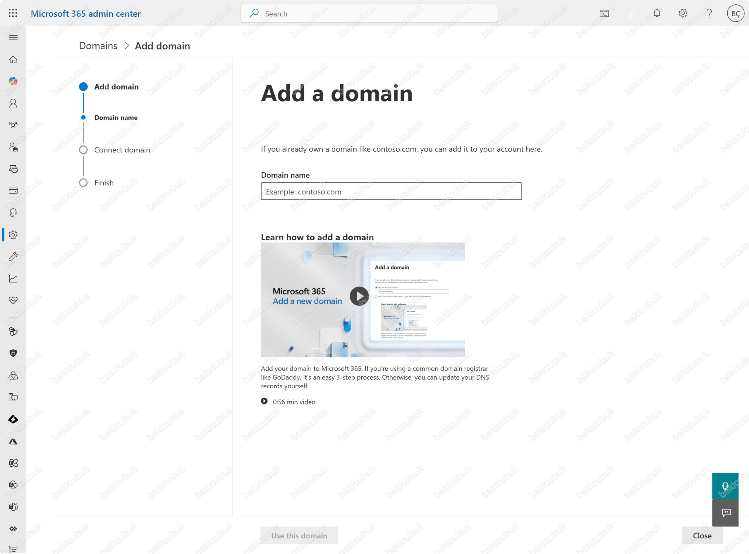 Microsoft 365 admin center konsolunda Add domain ekranın geliyor karşımıza.