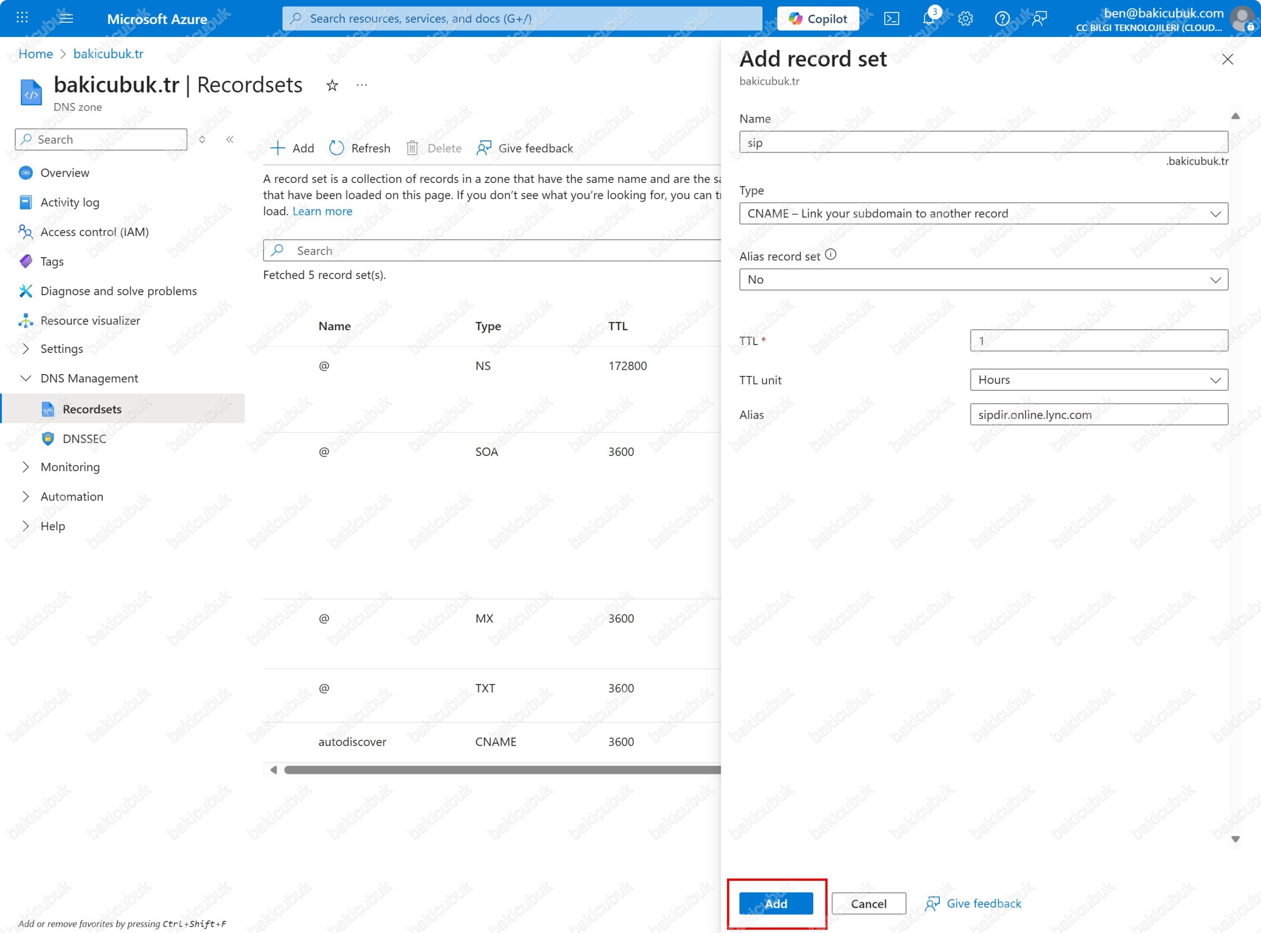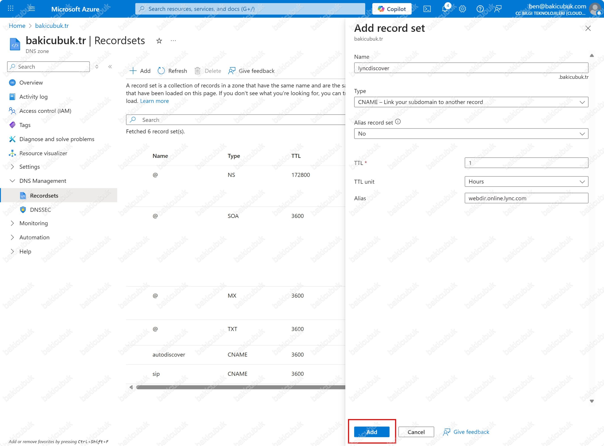 Add record set ekranında bakicubuk.tr alan adının Azure DNS Zone üzerinde Microsoft 365 üzerinde öncelikle CNAME (Canonical Name) kaydını ekliyoruz.