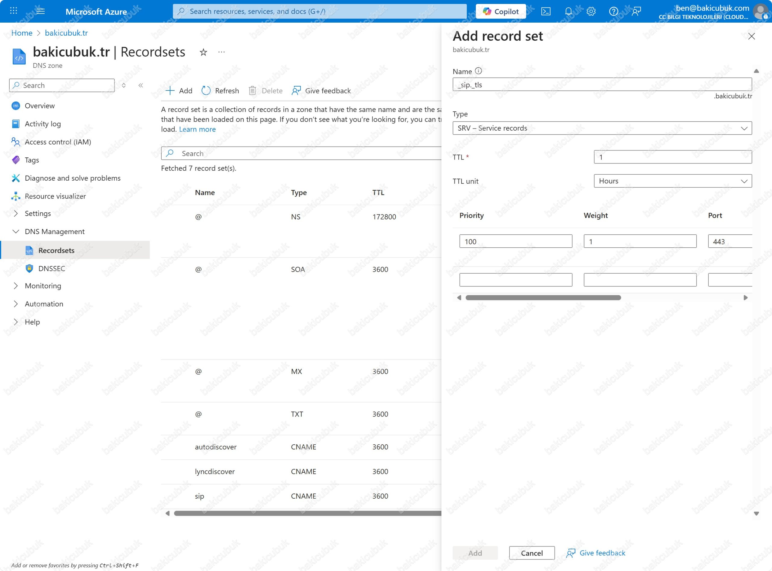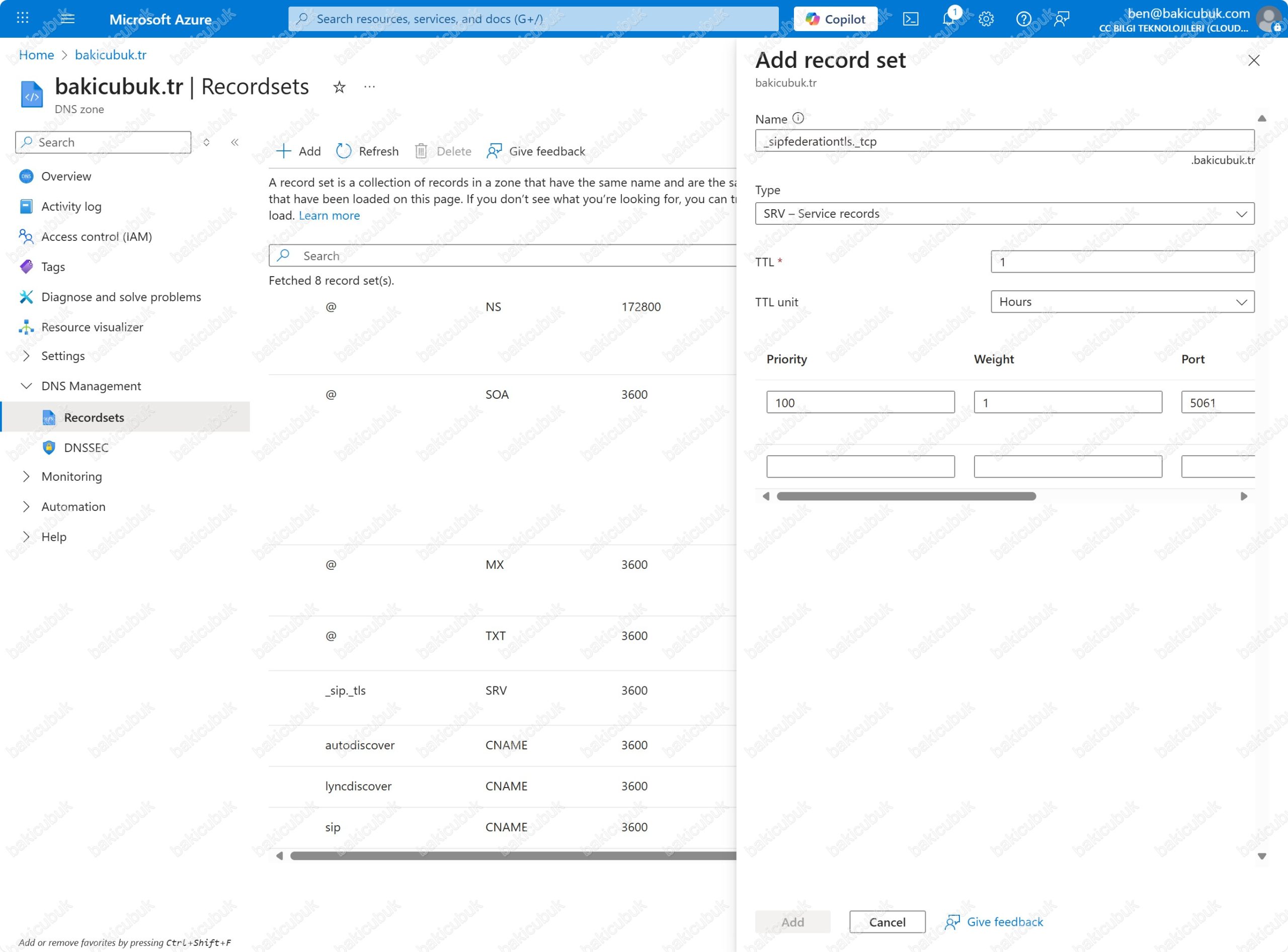 Add record set ekranında bakicubuk.tr alan adının Azure DNS Zone üzerinde Microsoft 365 üzerinde öncelikle SRV (Service Locator) kaydını ekliyoruz.