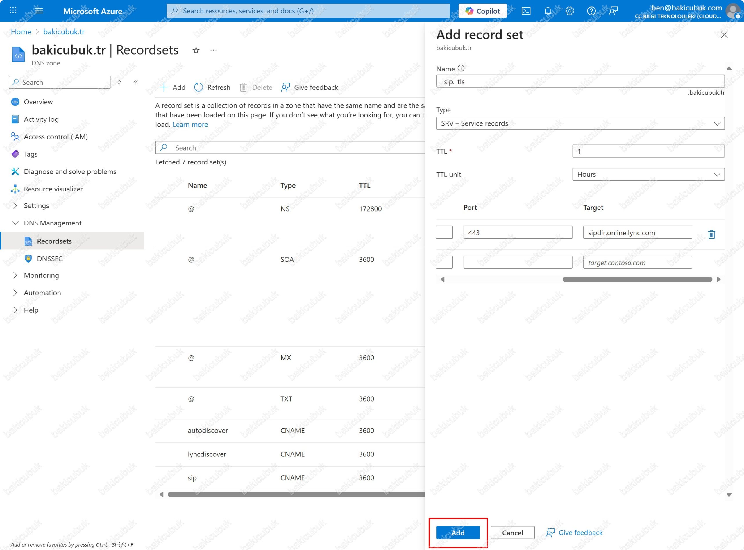 Add DNS records ekranında Skype for business seçeneği altında CNAME Records ve SRV records bölümleri altında bulunan 2 adet CNAME (Canonical Name) ve 2 adet SRV (Service Locator) DNS kaydını bakicubuk.tr alan adının Azure DNS Zone üzerine ekliyoruz.