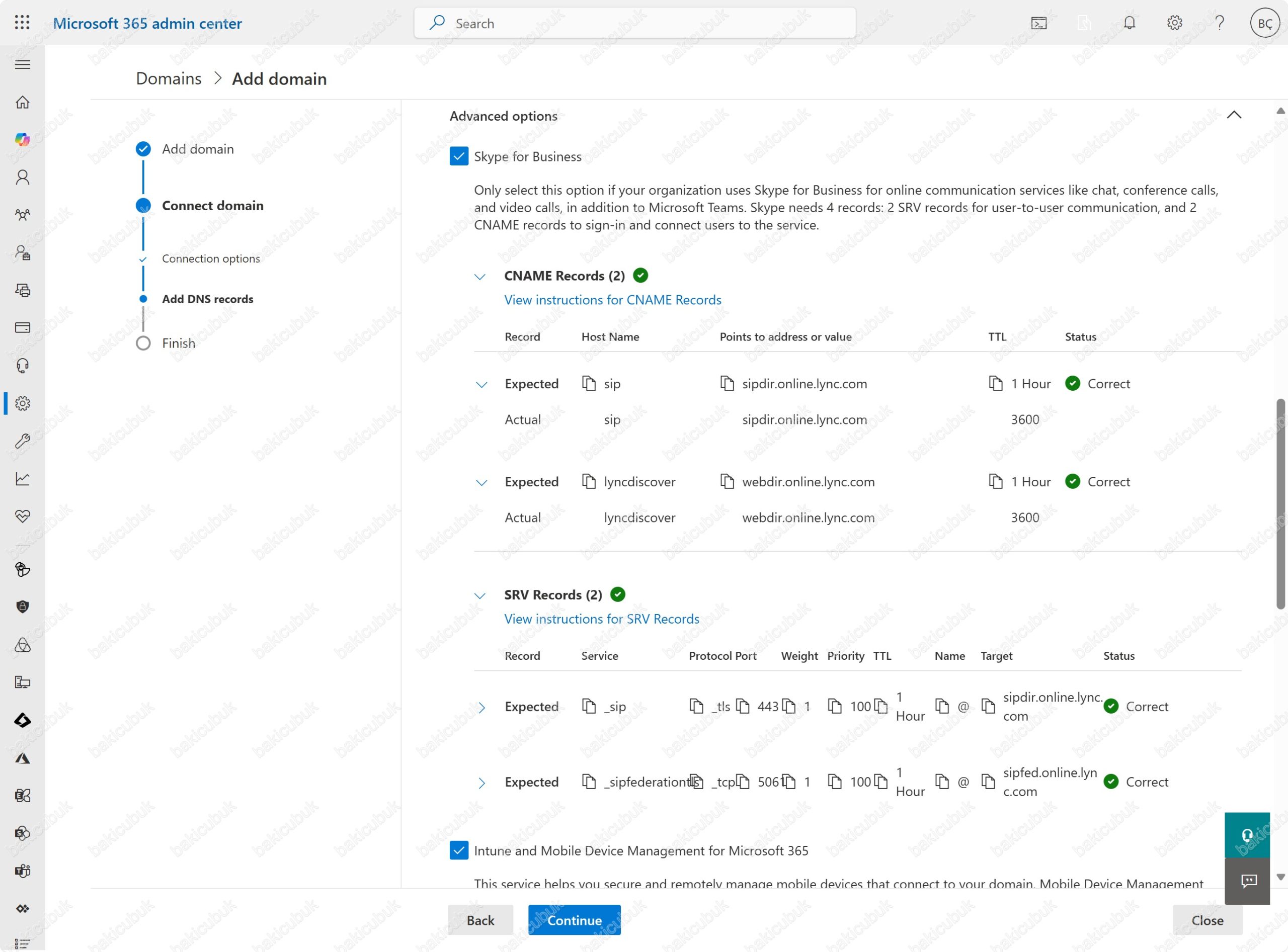 Add DNS records ekranında Skype for business seçeneği altında CNAME Records ve SRV records bölümleri altında bulunan 2 adet CNAME (Canonical Name) ve 2 adet SRV (Service Locator) DNS kayıtlarını oluşturduktan sonra Continue seçeneğine tıklayarak kontrol edebilirsiniz.