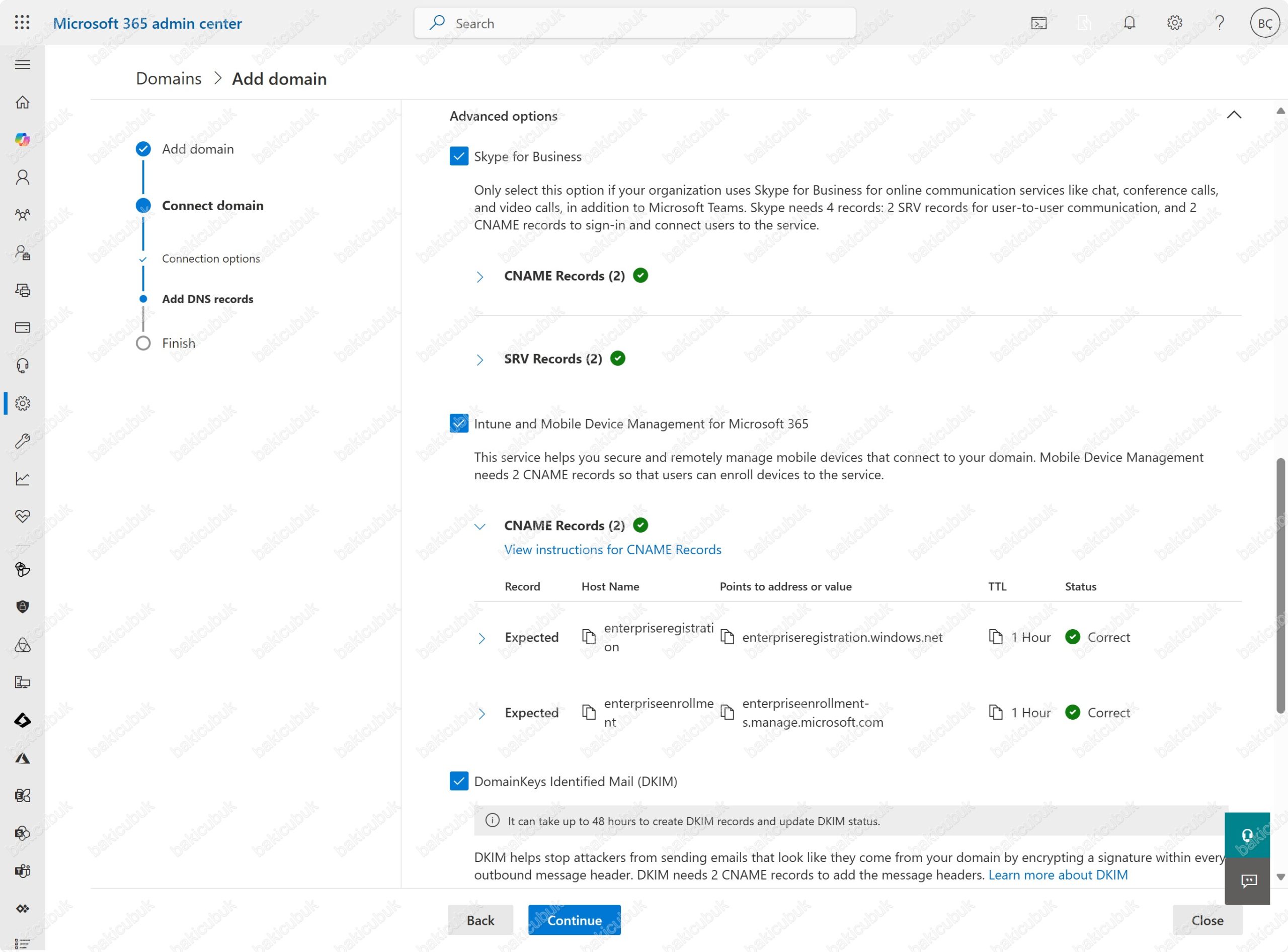 Add DNS records ekranında Advanced options seçeneği altında Skype for Business (Microsoft Teams), Intune and Mobile Device Management for Microsoft 365 ve DomainKeys Identified Mail (DKIM) servislerinin bakicubuk.tr alan adı için bu servislerin kullanılması için seçebilirsiniz.