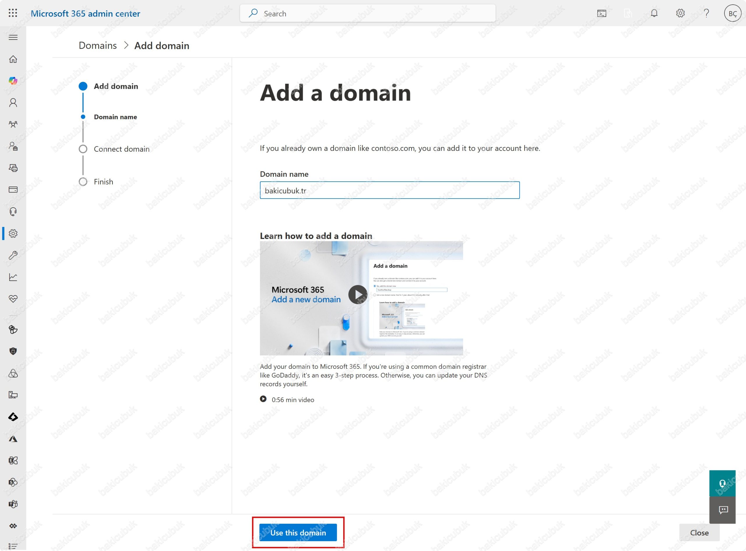 Microsoft 365 admin center konsolun da Domains ekranın da Add domain seçeneği ile bakicubuk.tr alan adı ekleme ve yapılandırma işlemini başlatıyoruz.