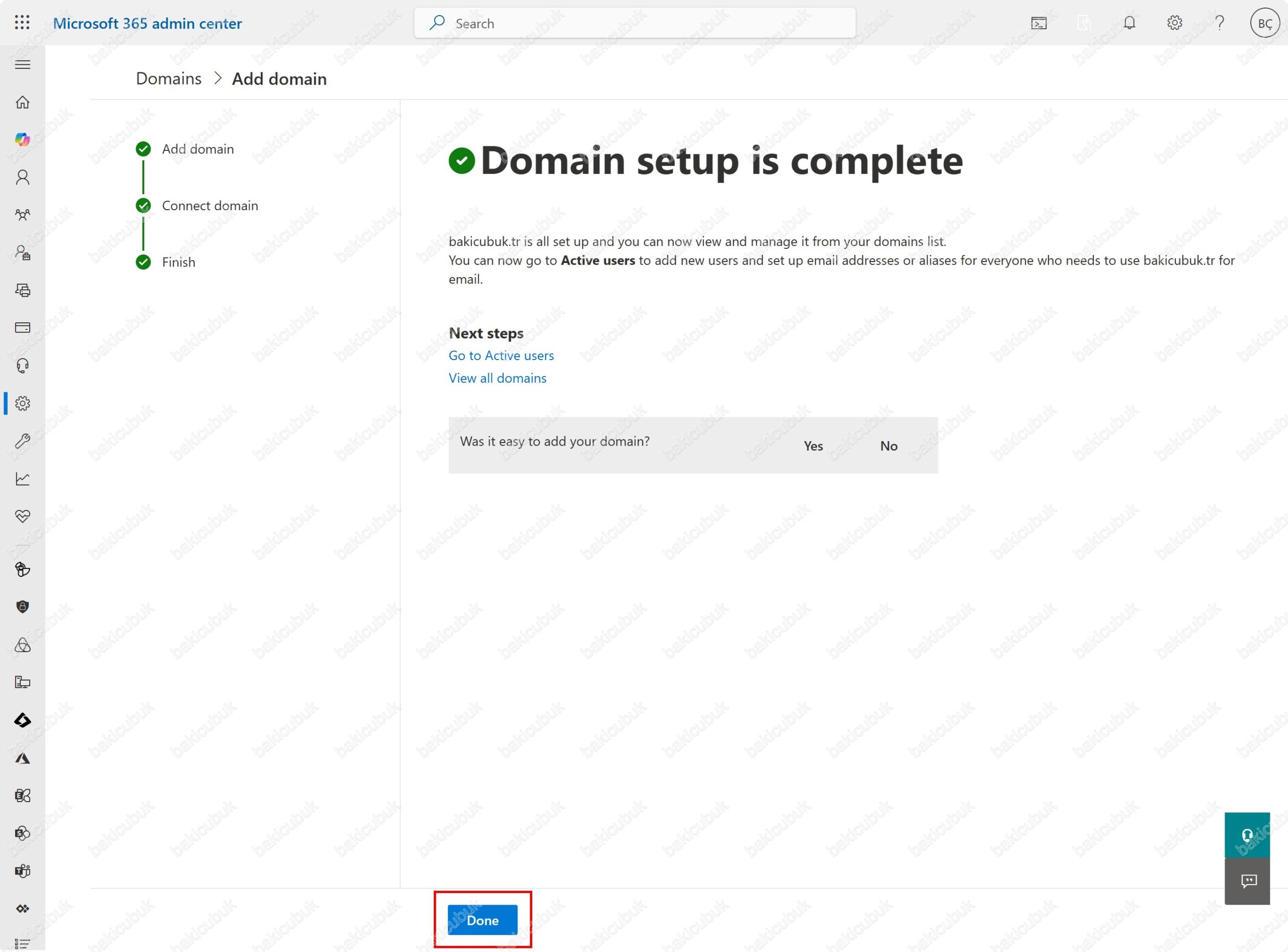 Domain setup is complete ekranında Done seçeneği ile devam ediyoruz.