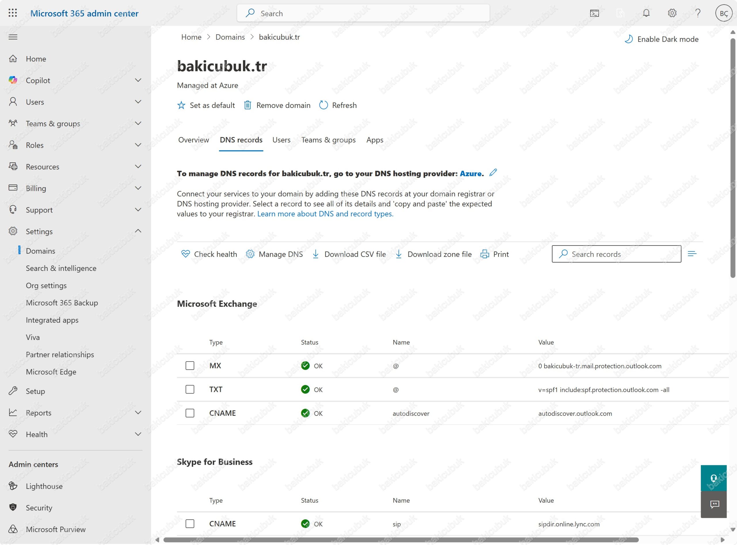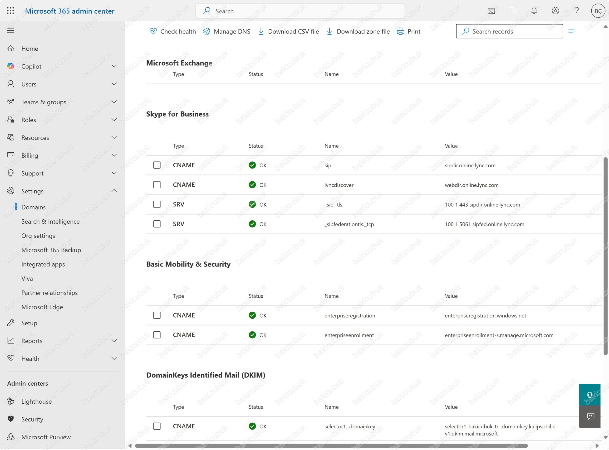 DNS records menüsü altında altında bakicubuk.tr alan adını için yapılandırmış olduğumuz Intune and Mobile Device Management for Microsoft 365 ve DomainKeys Identified Mail (DKIM) DNS kayıtlarını durumunu görüyoruz.