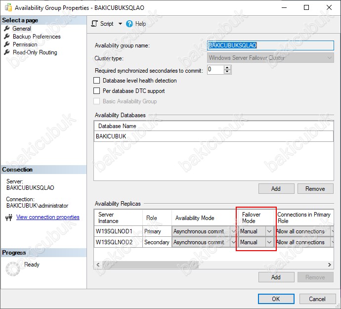 Availability Group Properties – BAKICUBUKSQLAO isimli Availability Group yapısının yapılandırılmış ayarlarını görüyoruz.
