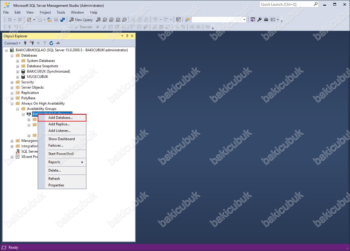 MUGECUBUK isimli Database ( Veritabanı ) SQL Server Always ON yapısına dahil etmek için Availability Groups altında bulunan BAKICUBUKAO ismi ile yapılandırmış olduğumuz Availability Group yapılandırması üzerinde sağ tuş Add Database diyebiliriz.