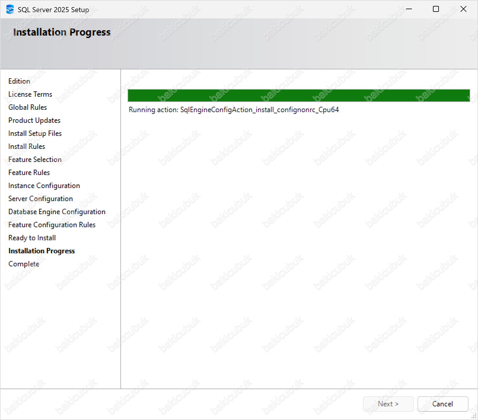 Installation Progress ekranında Microsoft SQL Server 2025 kurulumunun başarıyla başlatıldığını ve seçmiş olduğumuz tüm bileşenlerin sistem üzerine adım adım yüklendiğini görüyoruz. Bu aşamada SQL Server Database Engine, Client Tools, Management bileşenleri, gerekli servisler ve tüm yapılandırmalar arka planda otomatik olarak kurulmaktadır.