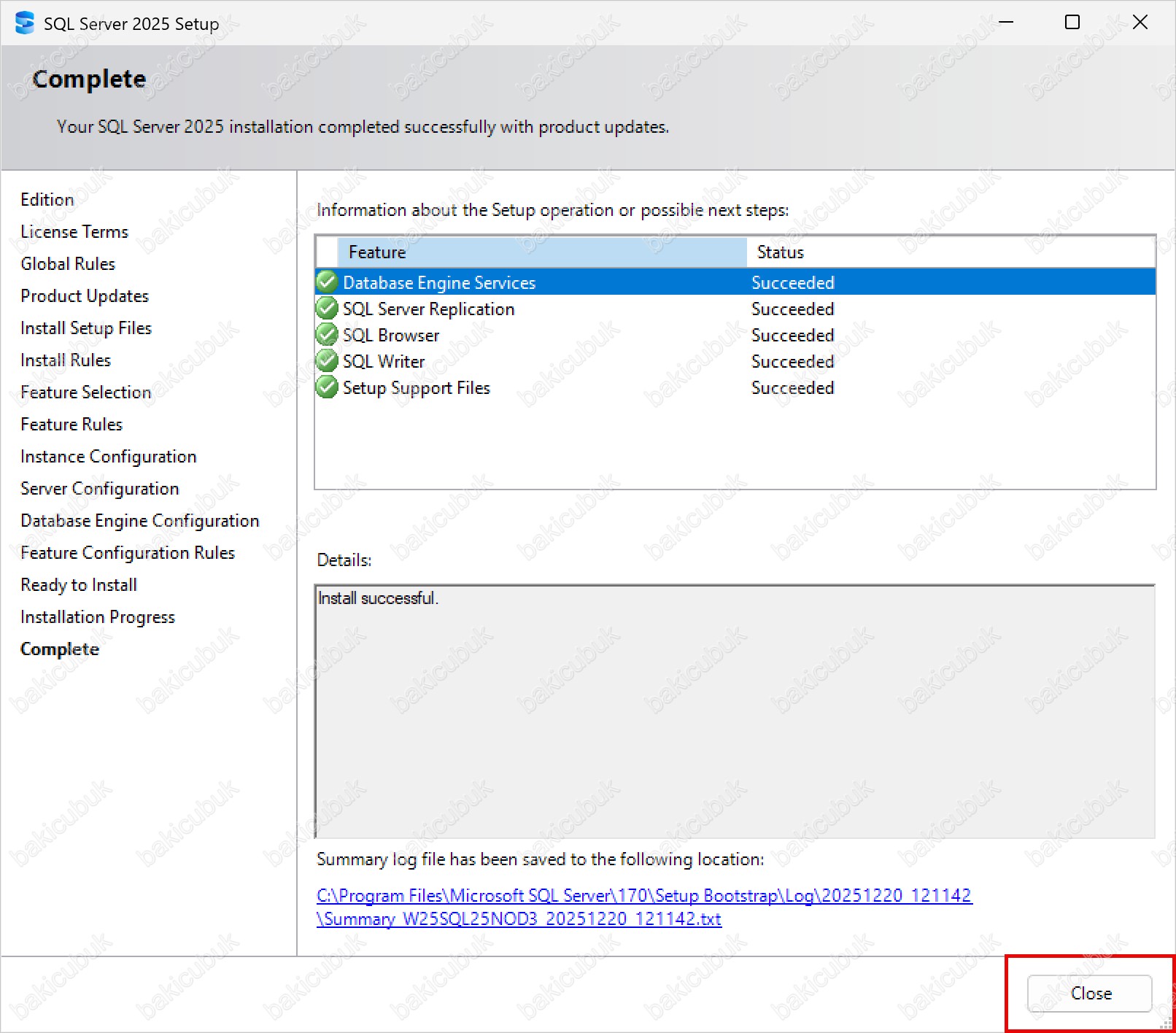 Kurulum başarıyla tamamlandıktan sonra Close seçeneğine tıklayarak SQL Server 2025 Setup ekranını kapatıyoruz. Bu aşama ile Microsoft SQL Server 2025 kurulumu başarıyla tamamlanmış olur.