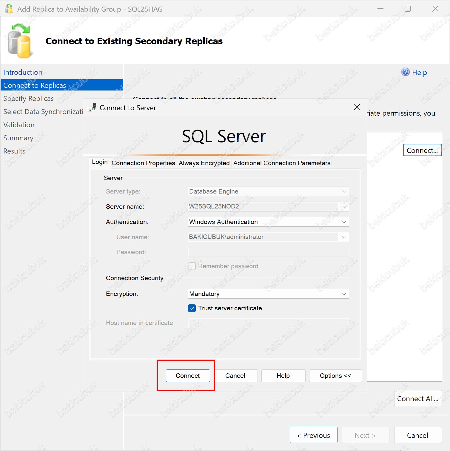 • Server Name bölümünde, bağlantı kurulacak W25SQL25NOD2 isimli sunucumuzun adını görüyoruz.