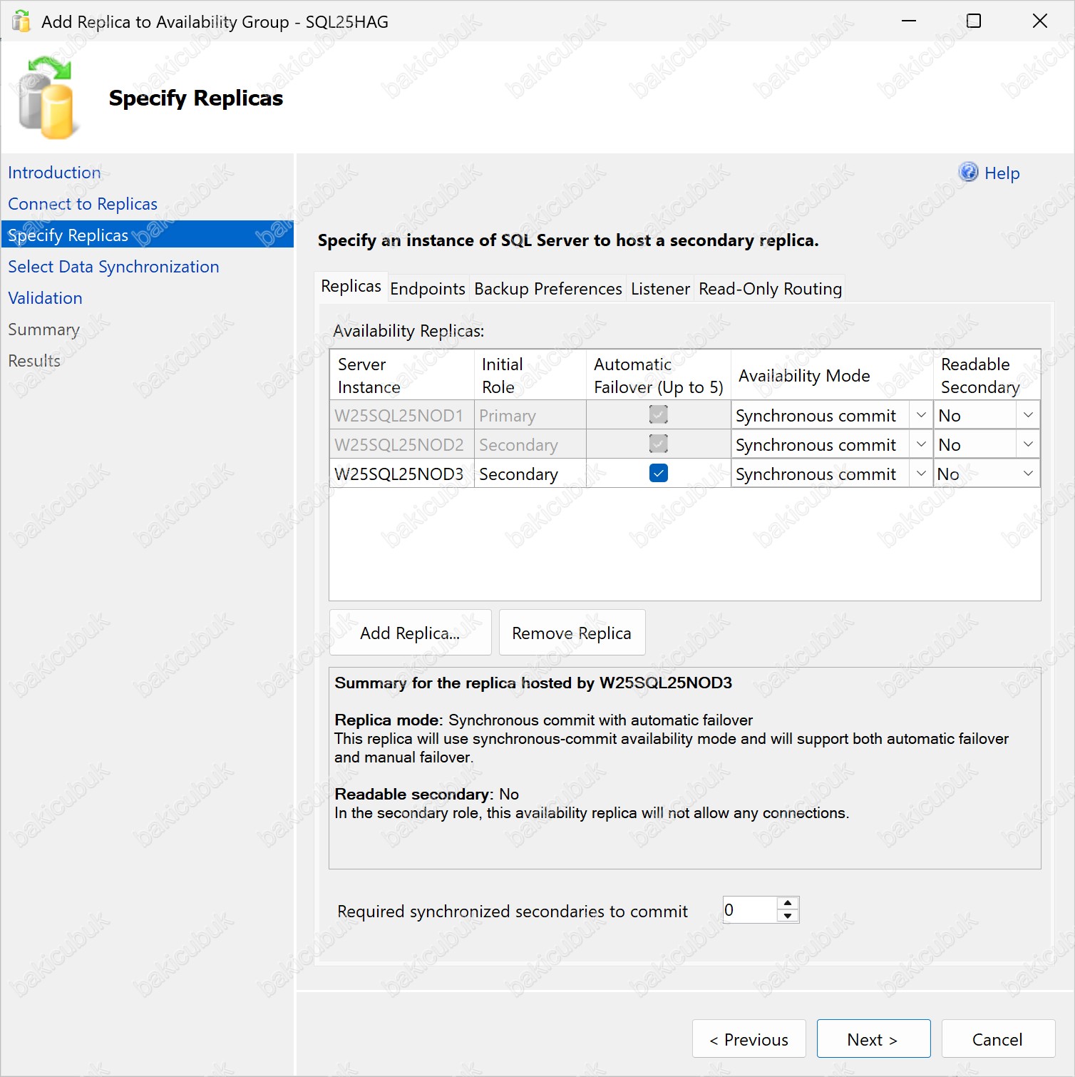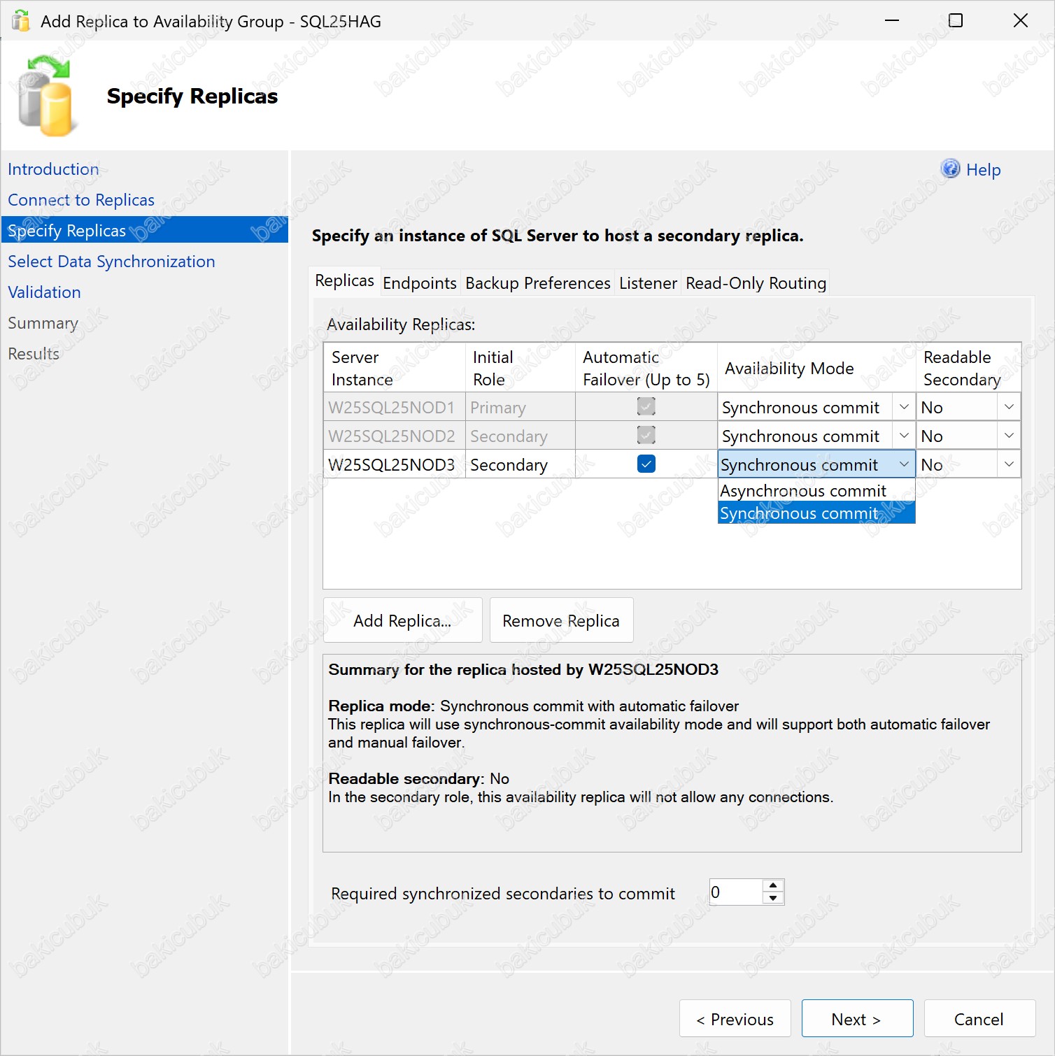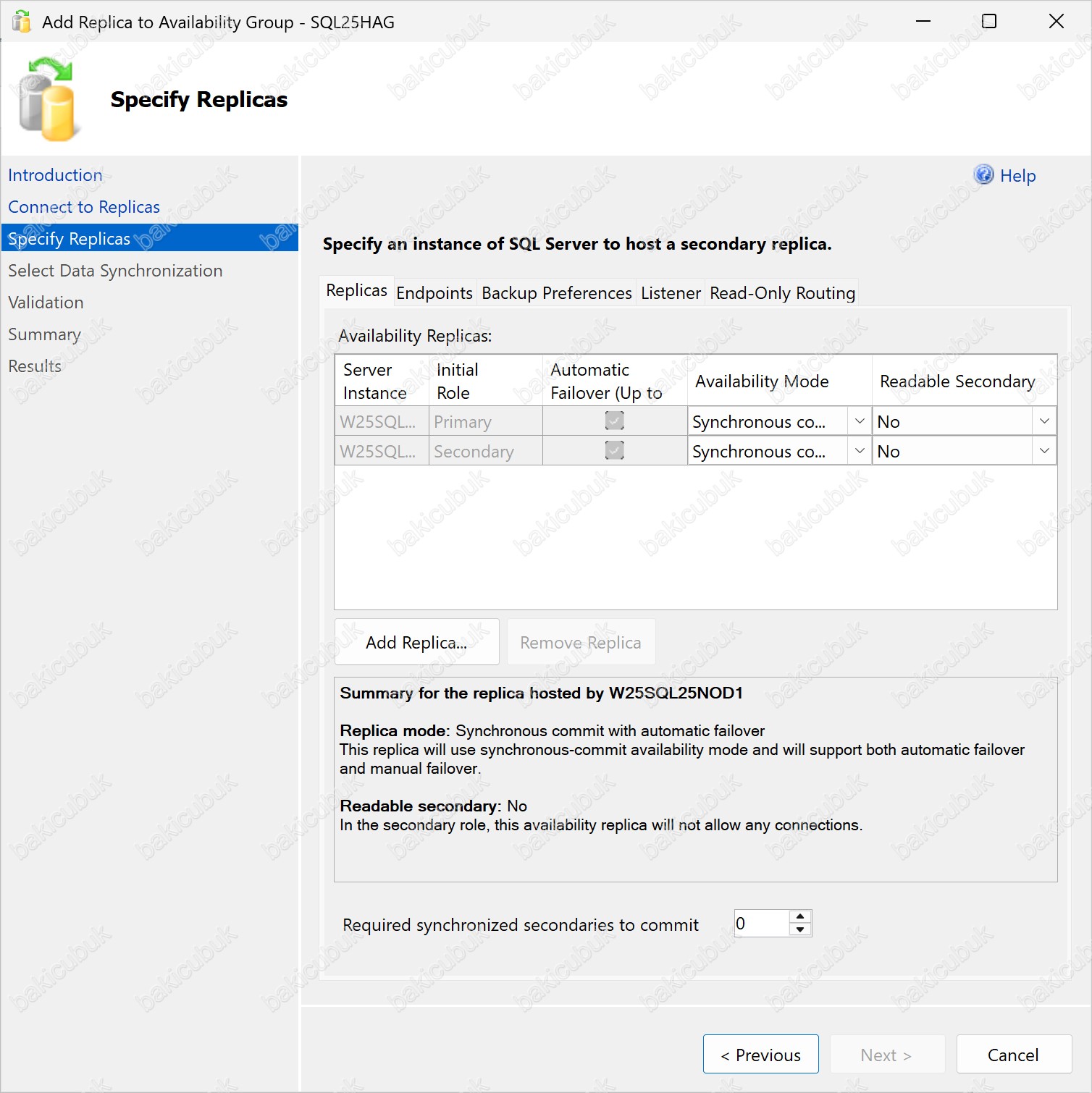 Add Replica to Availability Group – SQL25HAG ekranı geliyor karşımıza.