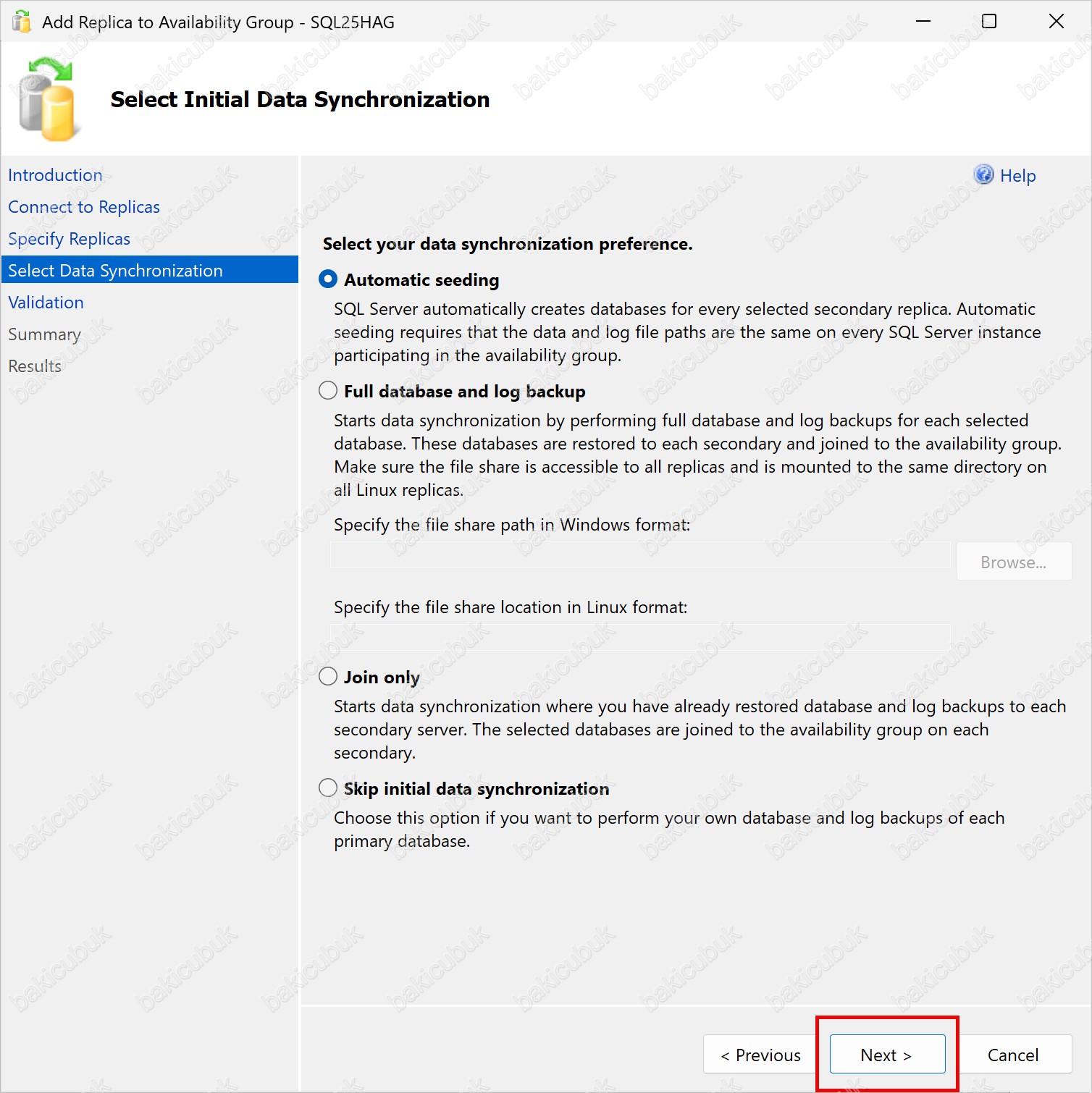 • Full database and log backup seçeneği ile devam edildiğinde ise, her bir veritabanının Full Backup ve Transaction Log Backup dosyaları, önceden yapılandırılmış bir Share (Paylaşım) üzerinden alınarak Secondary Replica (Node) otomatik olarak aktarılır. Bu yöntemin çalışabilmesi için SQL Server servis hesaplarının ilgili paylaşım üzerinde Read (Okuma) ve Write (Yazma) yetkilerine sahip olması gerekir. Ayrıca, paylaşım alanında veritabanı yedeklerinin sığabileceği yeterli disk alanı bulunmalıdır.