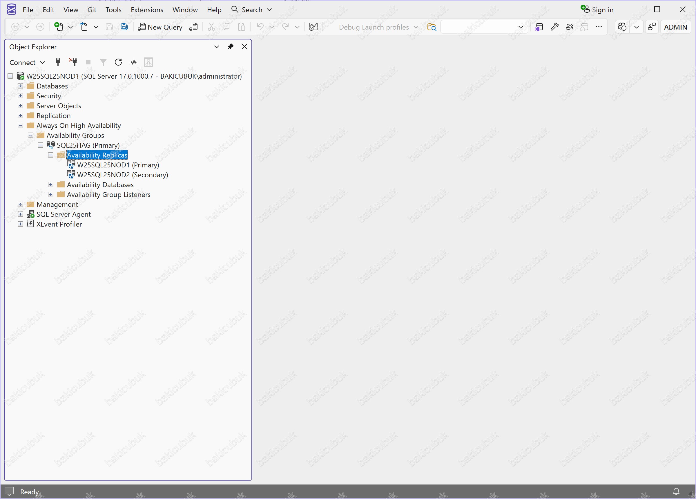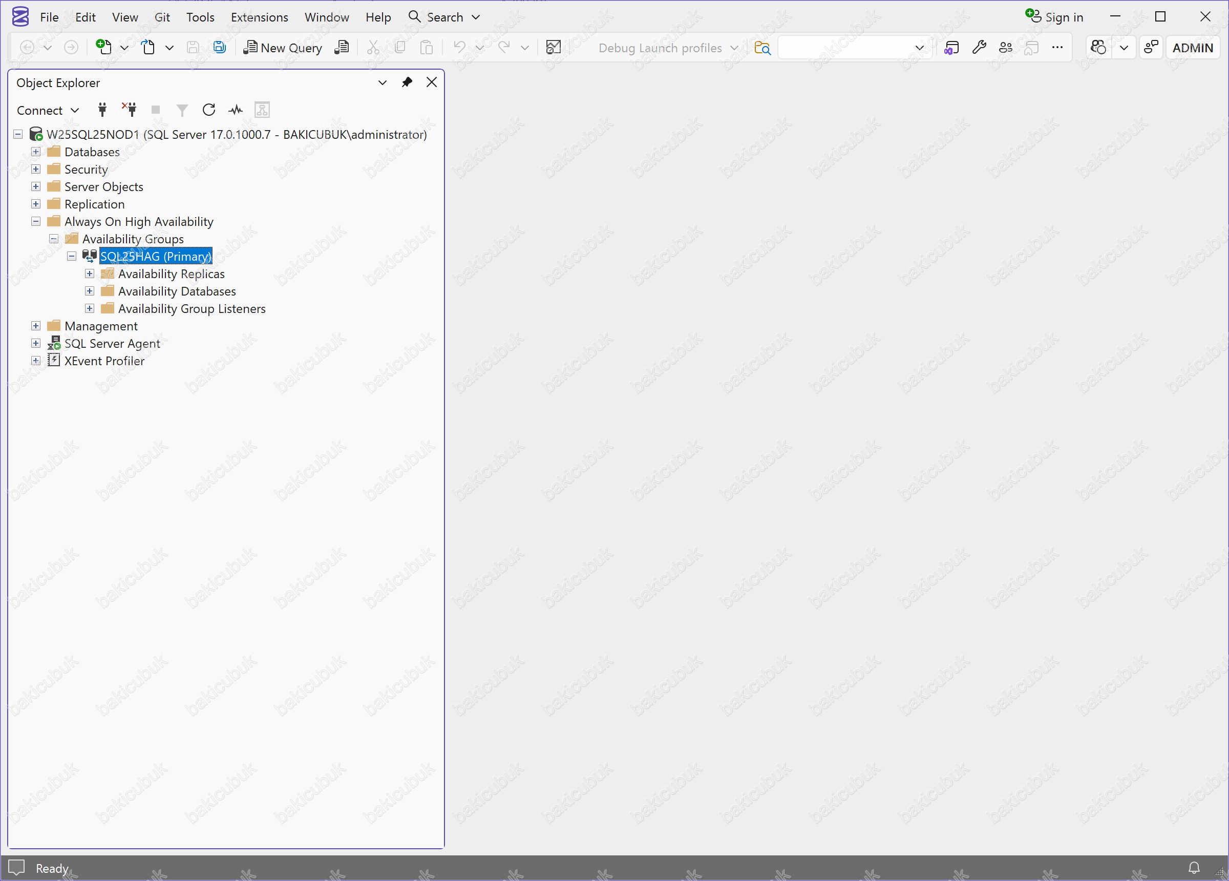 Microsoft SQL Server Management Studio (SSMS) konsolunda Always On High Availability bölümü altında yer alan Availability Groups kısmında SQL25HAG ismi ile yapılandırmış olduğumuz Availability Group yapısını görüyoruz.