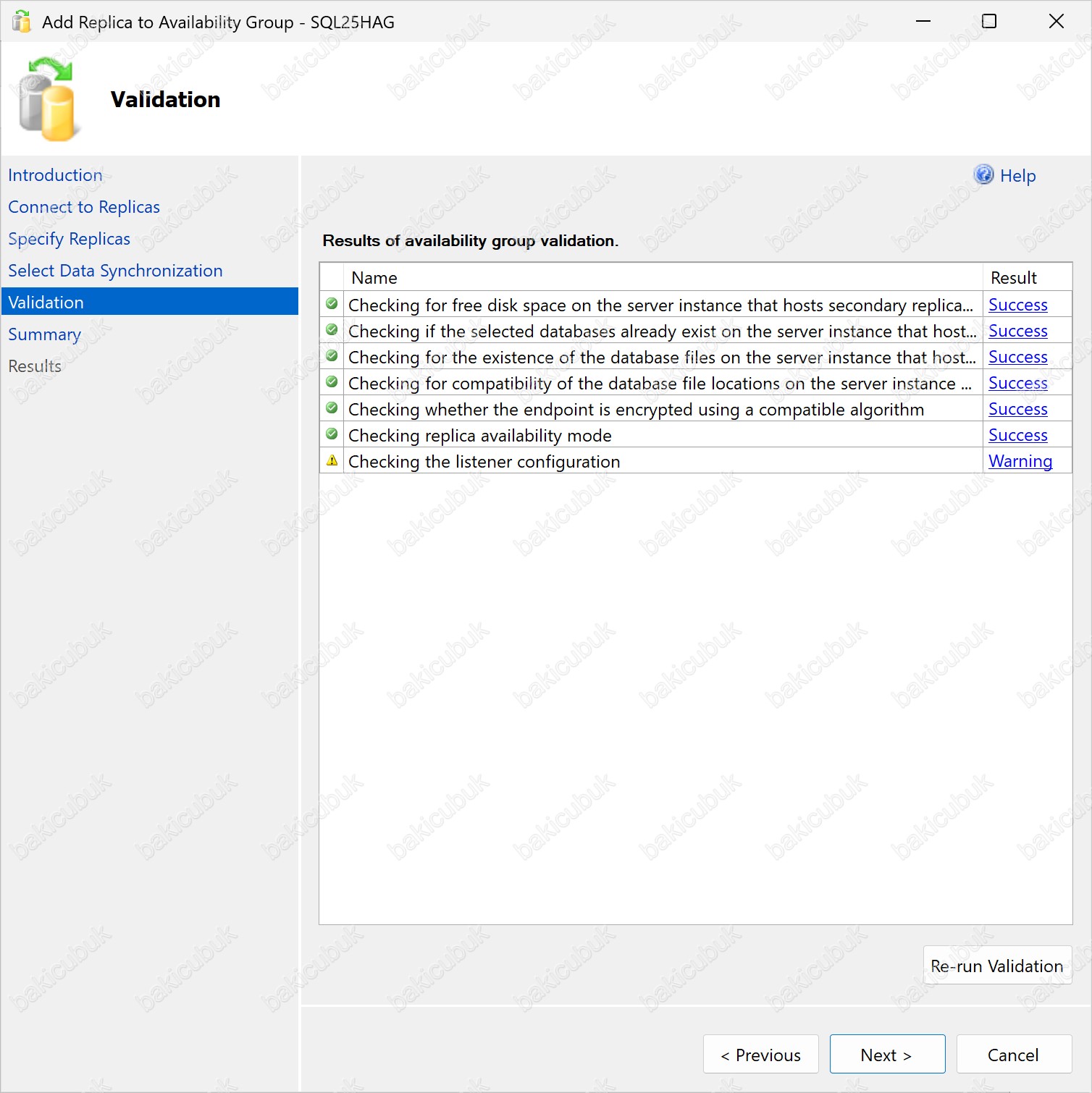 Eğer yapılandırmada herhangi bir problem olsaydı, ilgili adımlar Error olarak görüntülenirdi. Bu durumda Previous seçeneği ile geri dönerek hatalı yapılandırmayı düzeltebilir ve ardından Re-run validation ile kontrolleri yeniden çalıştırabilirsiniz.
